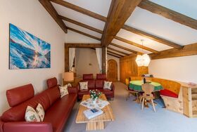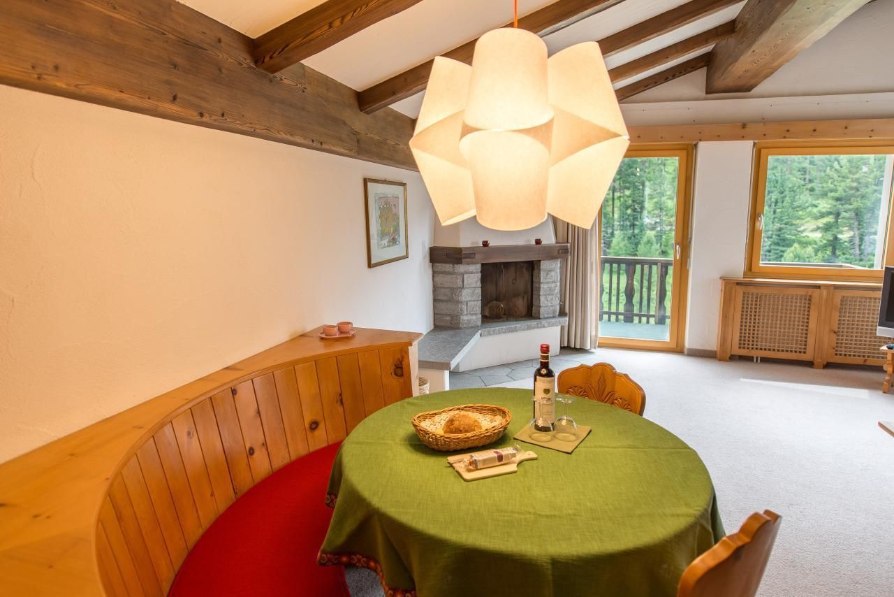 Sonstige Wohnzimmerausstattung (Wohnzimmer1): grosser Wohnraum, runder Arvenbank mit Esstisch und 2 Stühlen, Cheminée, grosse