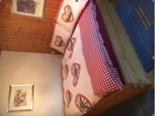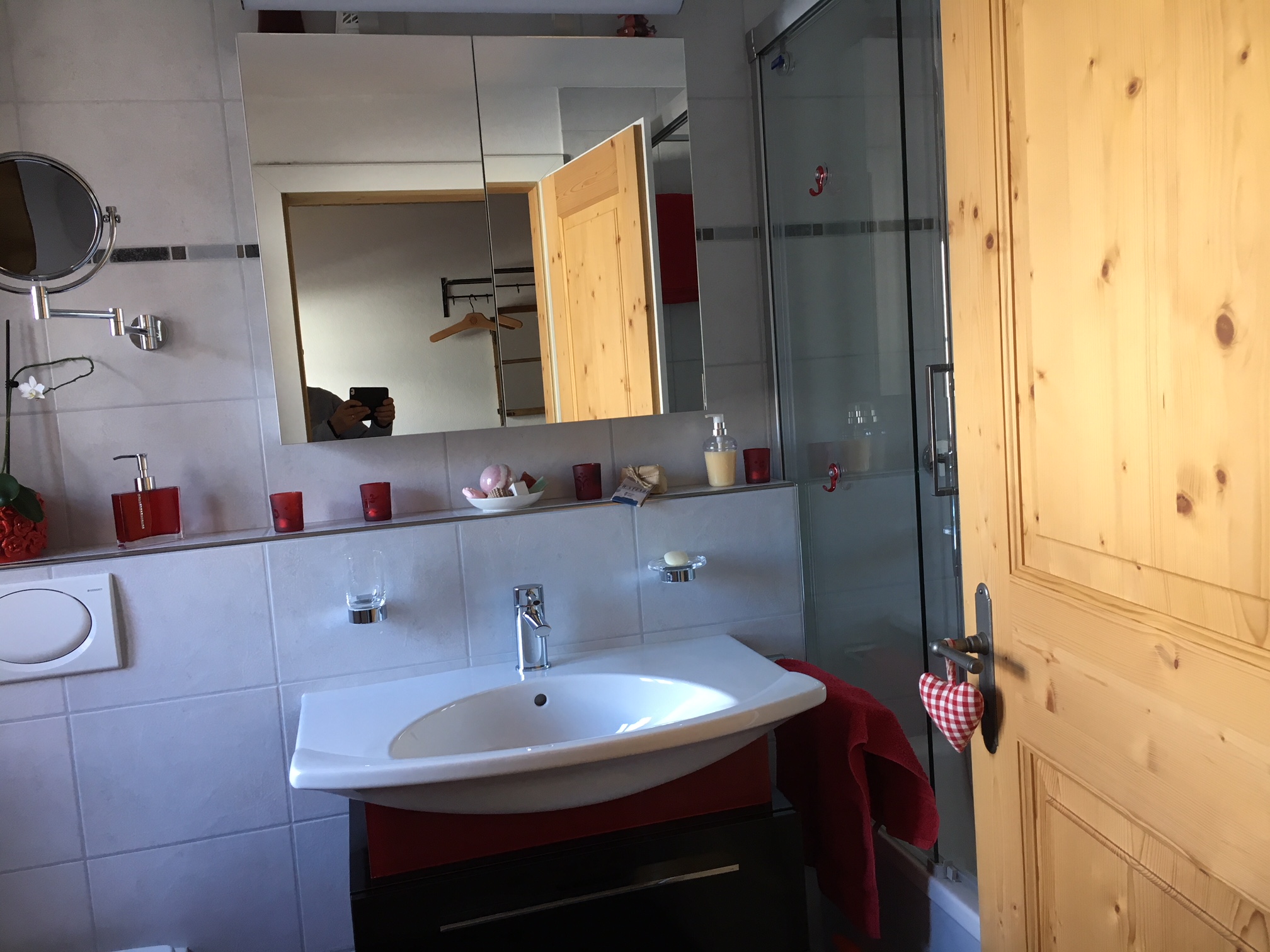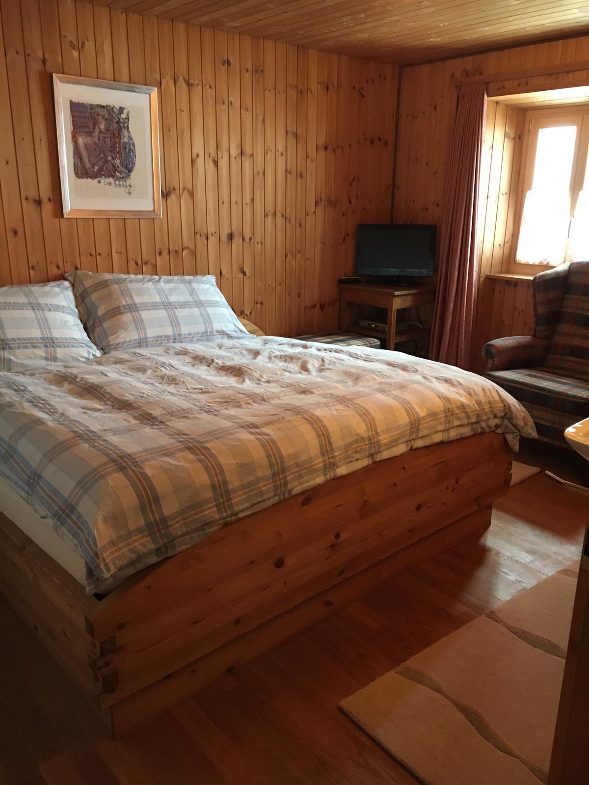 Gemütliches Doppelzimmer mit Lavabo. Ihr eigenes Bad mit Regendusche und WC befindet sich vis à vis des Zimmers.