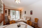 Sonstige Wohnzimmerausstattung (Wohnzimmer1): Eßtisch für 5 Personen, bequeme Couchgruppe mit Tisch, Polstersessel und Stehlampe, Keramikfliesen-Bodenbelag, Orientteppich, bei Bedarf: nachts durch im Schrank eingebautes Doppelbett als zweites Schlafzimmer für 1 - 2 Personen nutzbar, wenn die Betten im Schlafzimmer nicht reichen