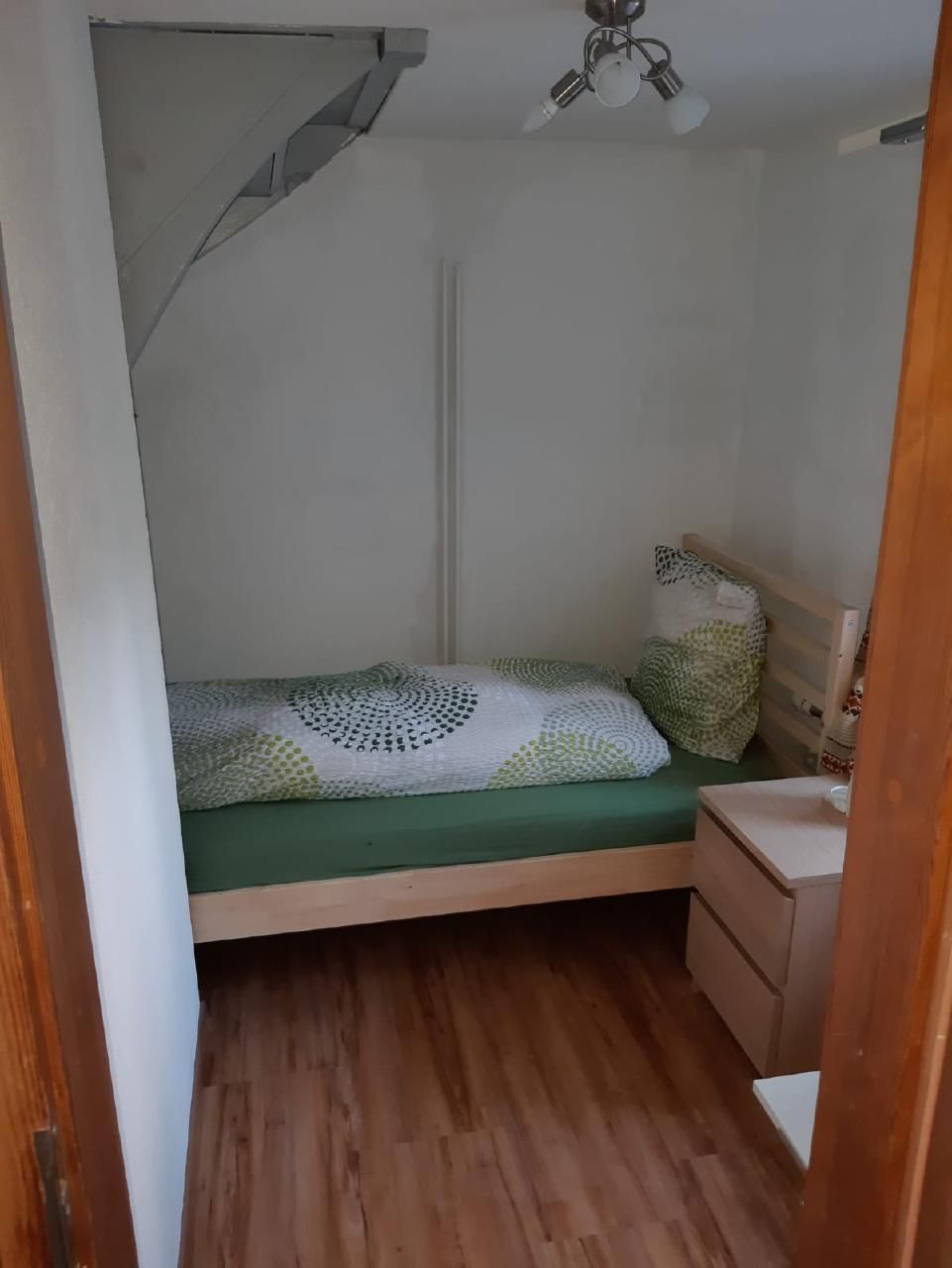 Die Wohnung ist auf 2 Geschosse im Oberen Geschoss befindet sich das Wohnzimmer und die Küche, plus Ein Schlafzimmer und die Dusche mit WC.