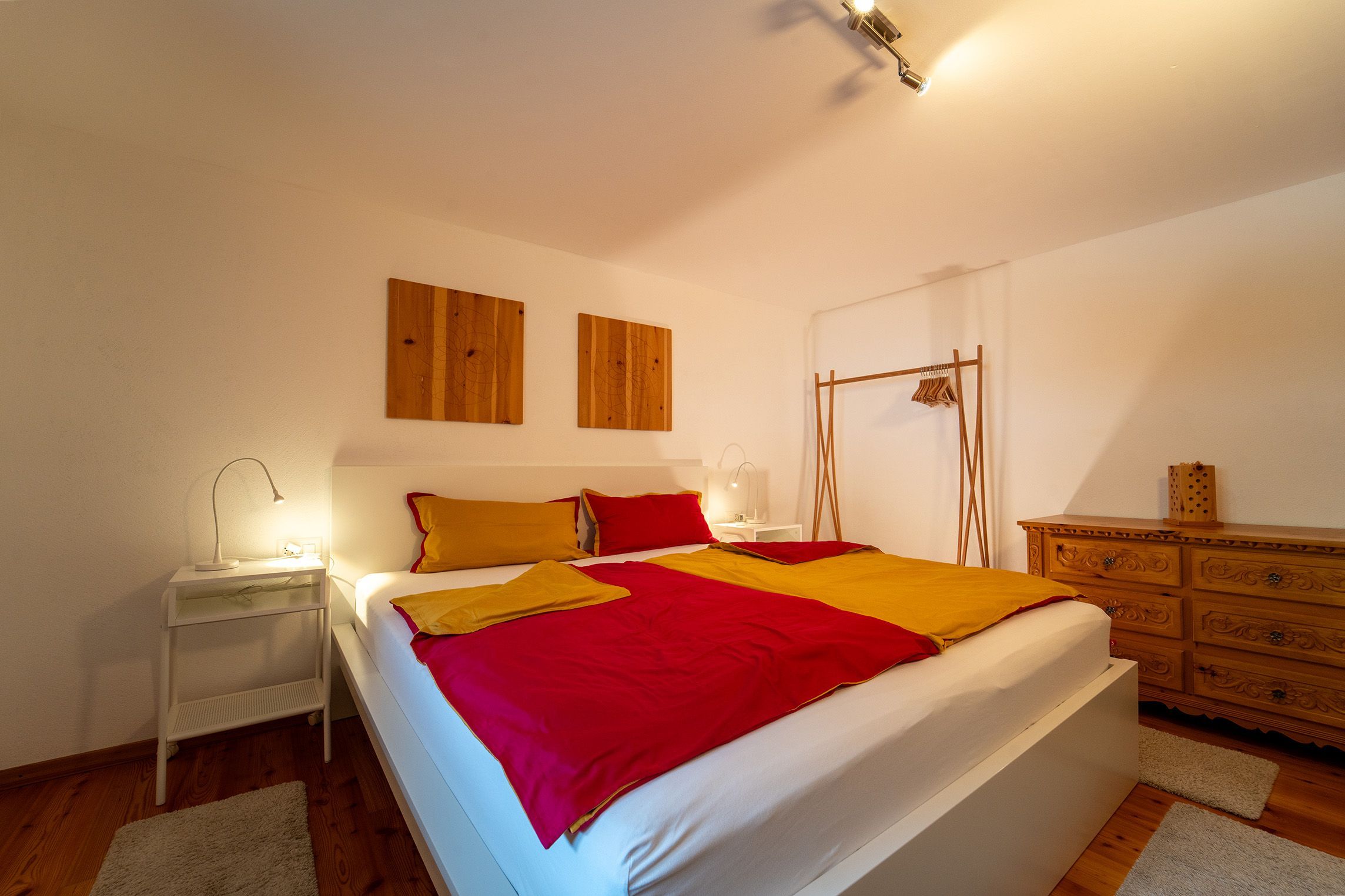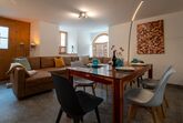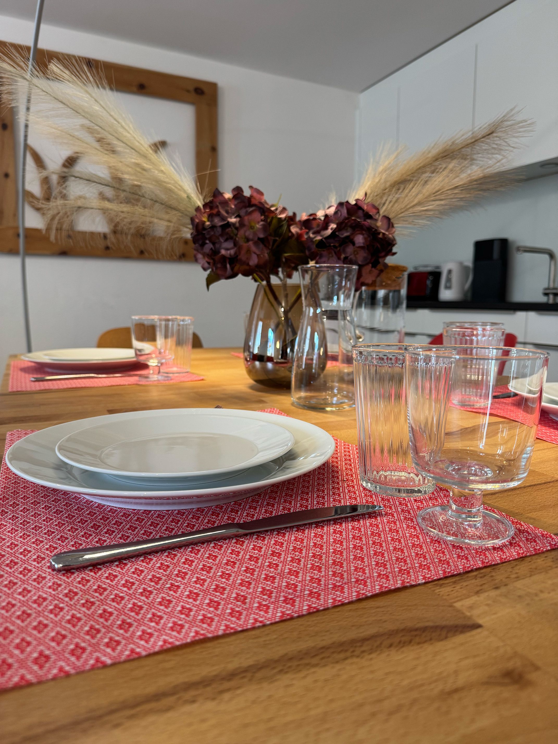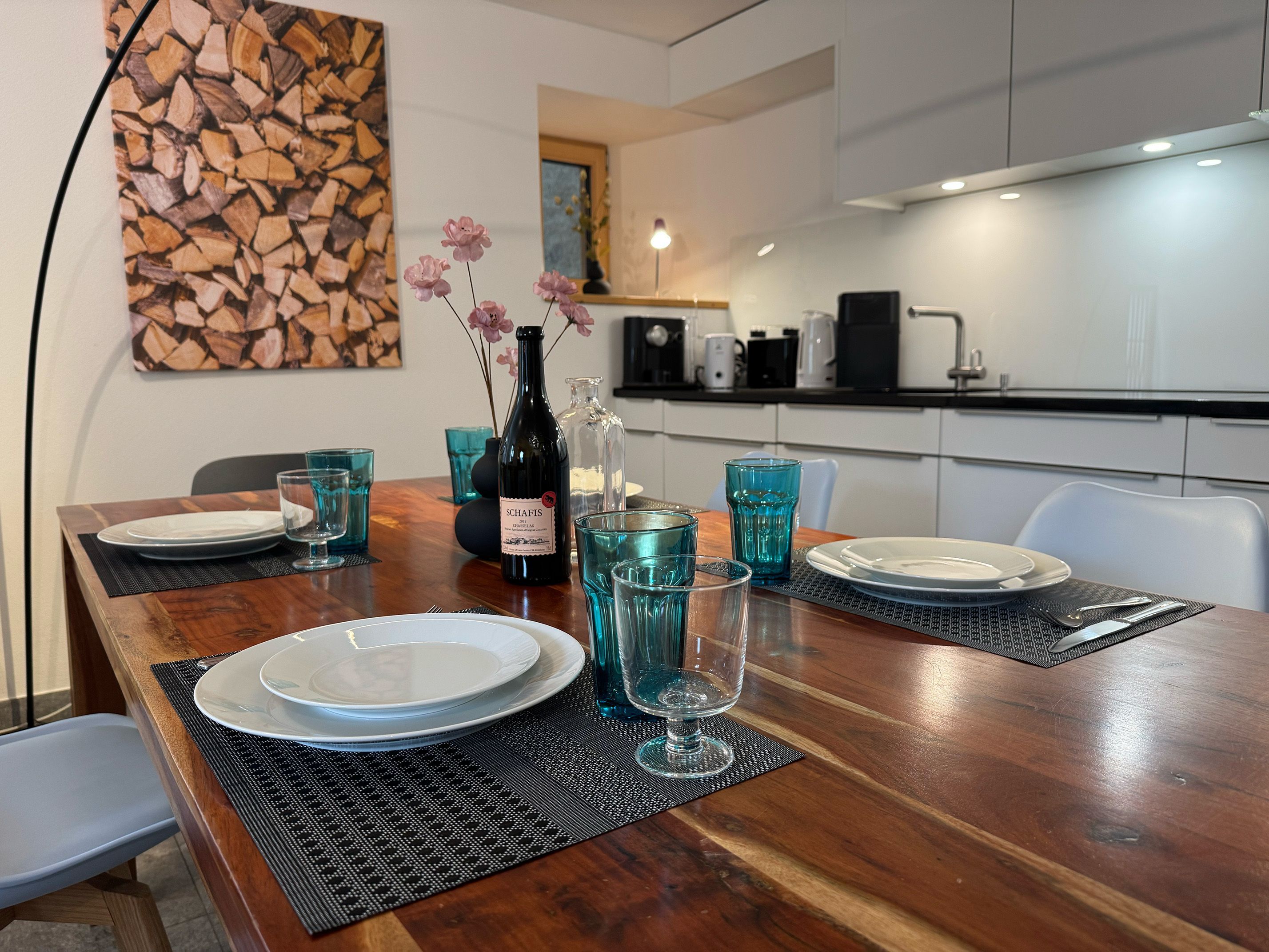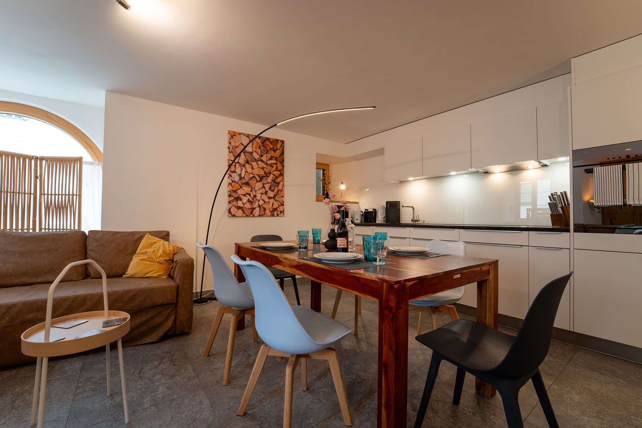 - Jede Wohnung verfügt über einen grosszügigen, offen gestalteten Wohn-, Ess- und Küchenbereich – komplett ausgestattet und gemütlich eingerichtet. Die grössere Essbereich im Obergeschoss eignet sich für bis zu 12 Personen, die kleinere für bis zu 6 Personen
