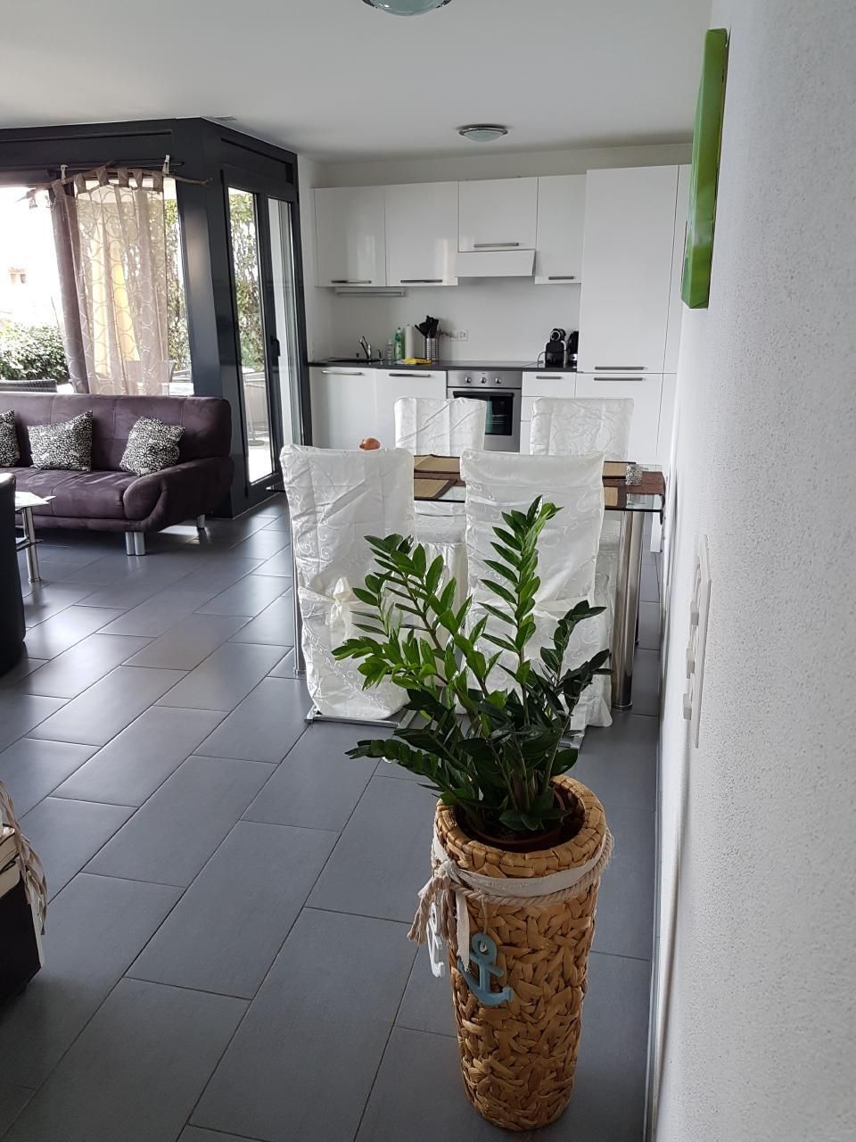 Zur Wohnung gehört eine sonnige Sitzecke mit Gartentisch und Liegestühlen sowie eine Liegewiese direkt vor der Wohnung. Hier können Sie die Ruhe und den Blick über die Dächer von Brissago und den Lago Maggiore genießen.