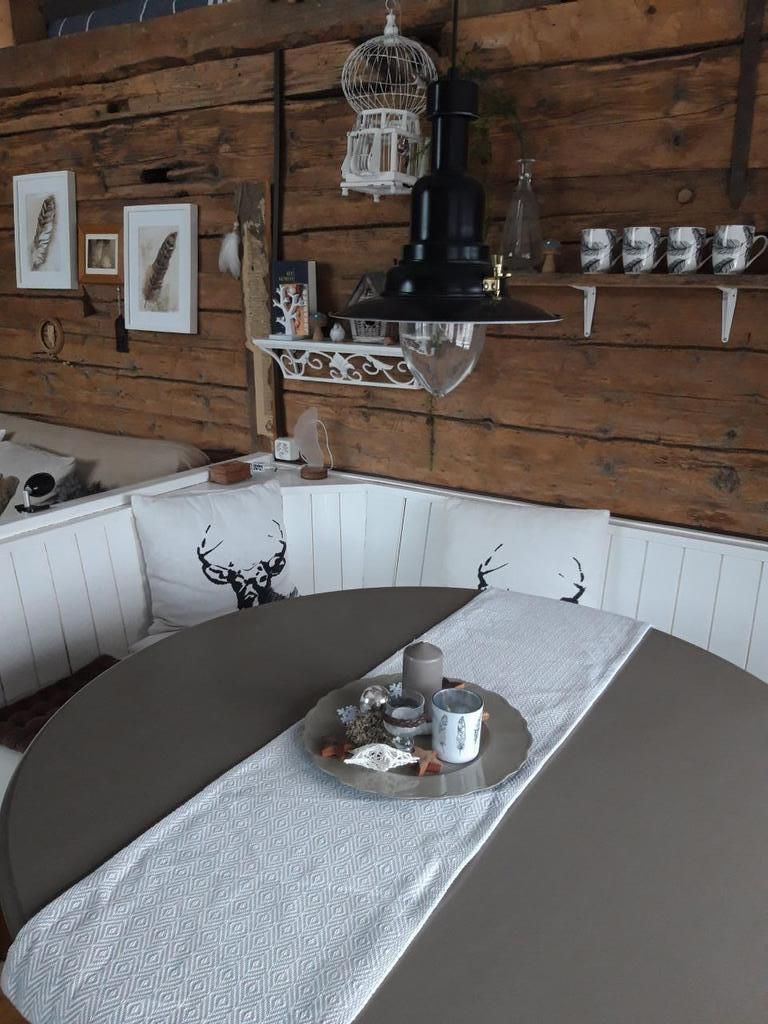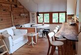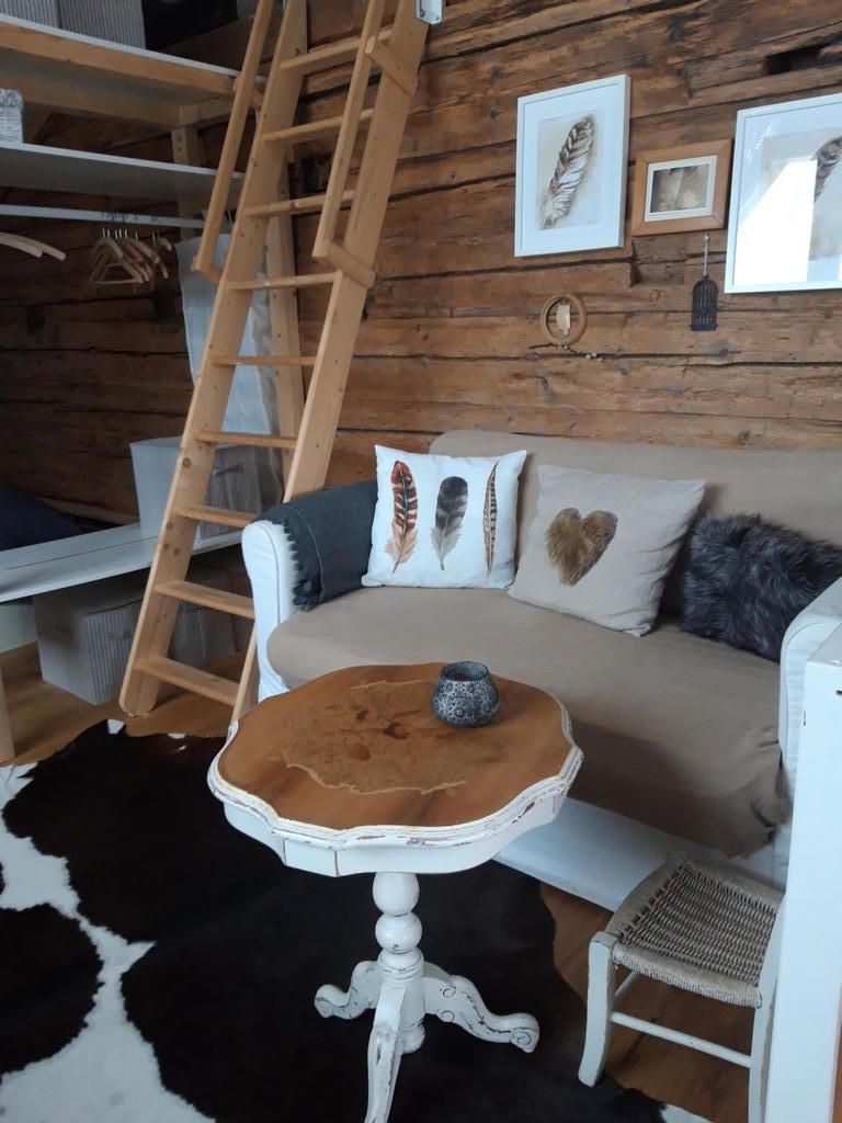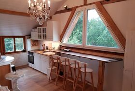 Sonstige Wohnzimmerausstattung (Wohnzimmer1): Das Studio ist ein grosser Raum. Es hat ein Doppelbett (160 x 200) und in der Schlafluke unter dem Dach auch eine Matratze (160 x 200), zudem für Kleinkinder ein ausziehbares Sofa. Die Essecke bietet genügend Platz für 4 - 6 Personen und auch zum Verweilen. Die Küche ist gut ausgerüstet und lässt nicht zu wünschen übrig. An der Bar vor dem Panoramafenster hat man die Gelegenheit die Natur, die umliegende Berglandschaft und das Wetter zu beobachten.