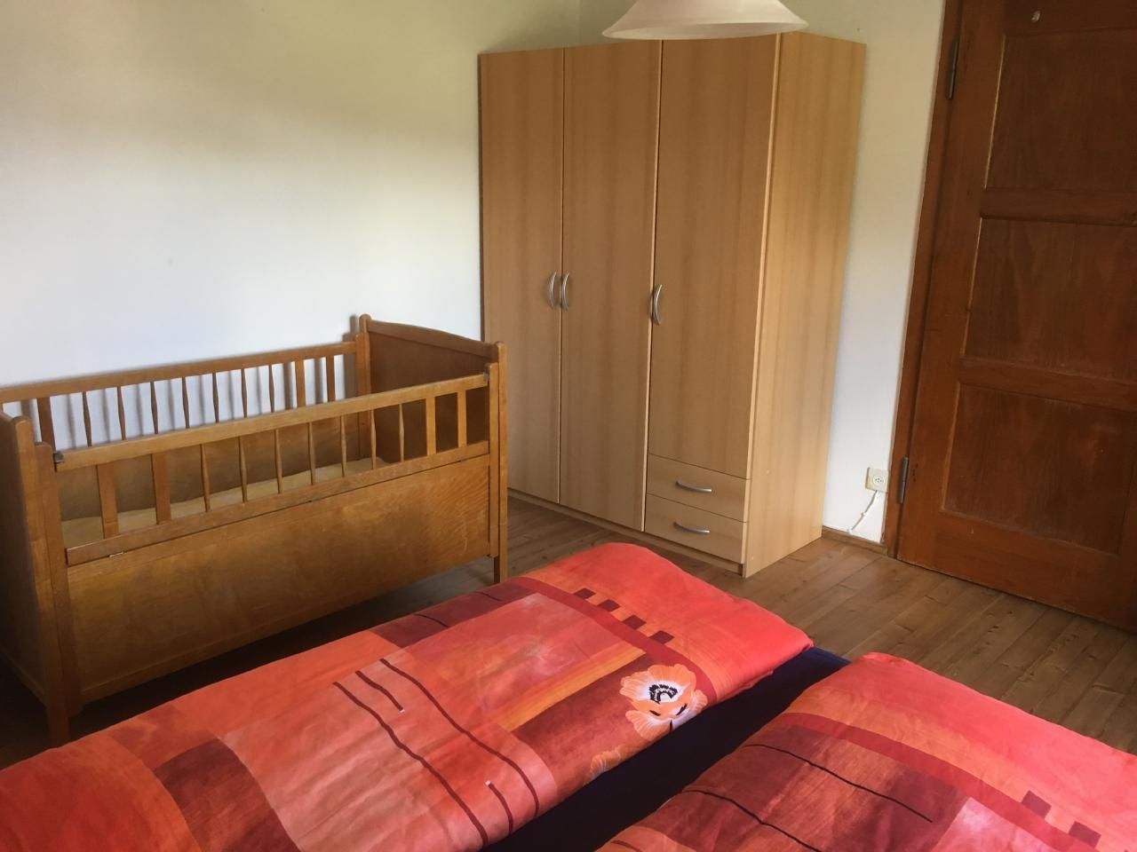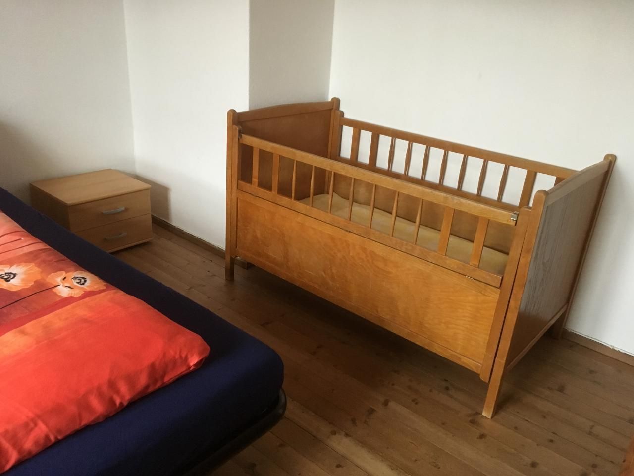 Schlafzimmereinrichtung 1: Doppelbett, Einbauschrank, freistehender Kleiderschrank, Stuhl, 2 Nachttische, Kinderbett.
