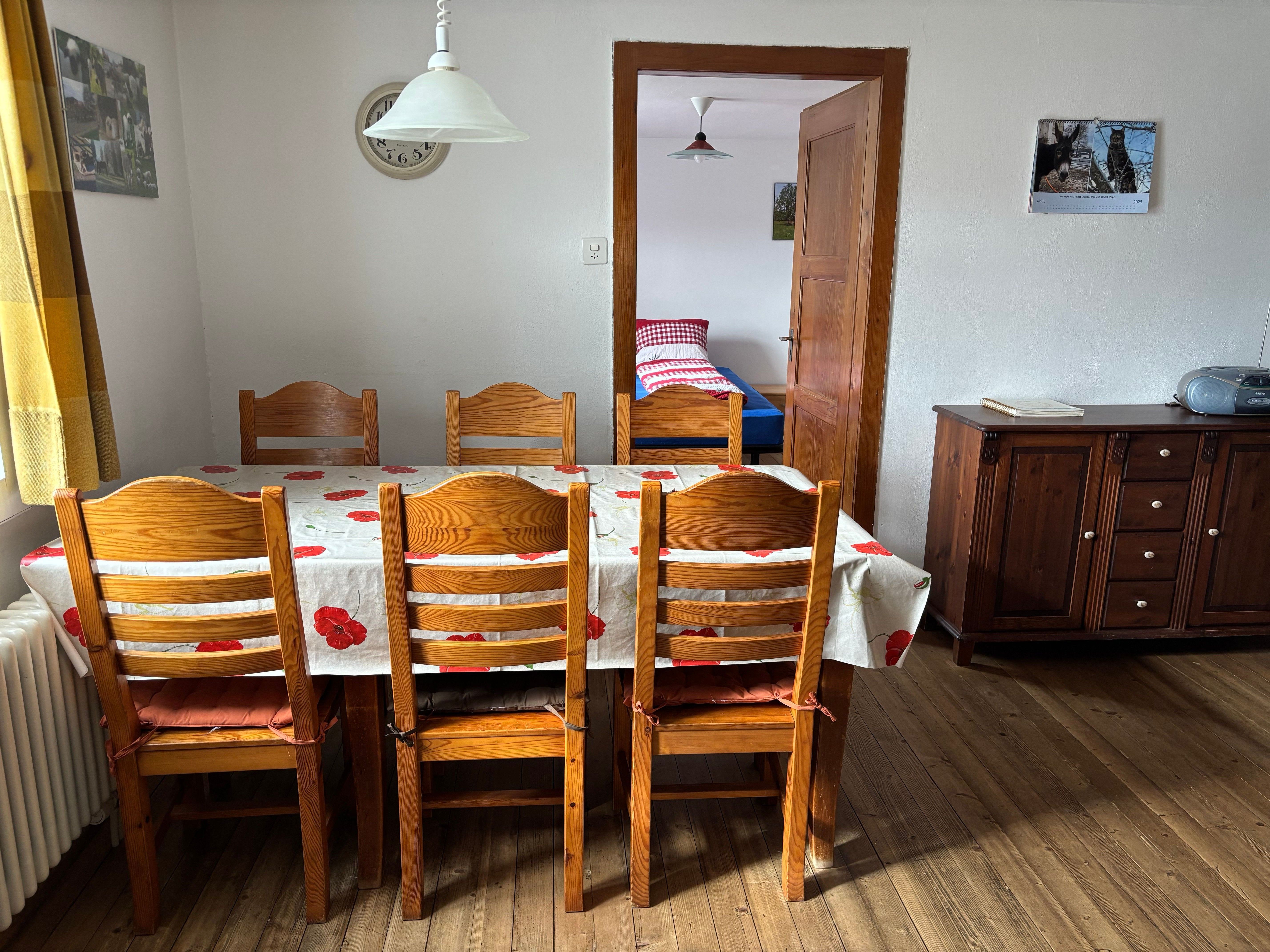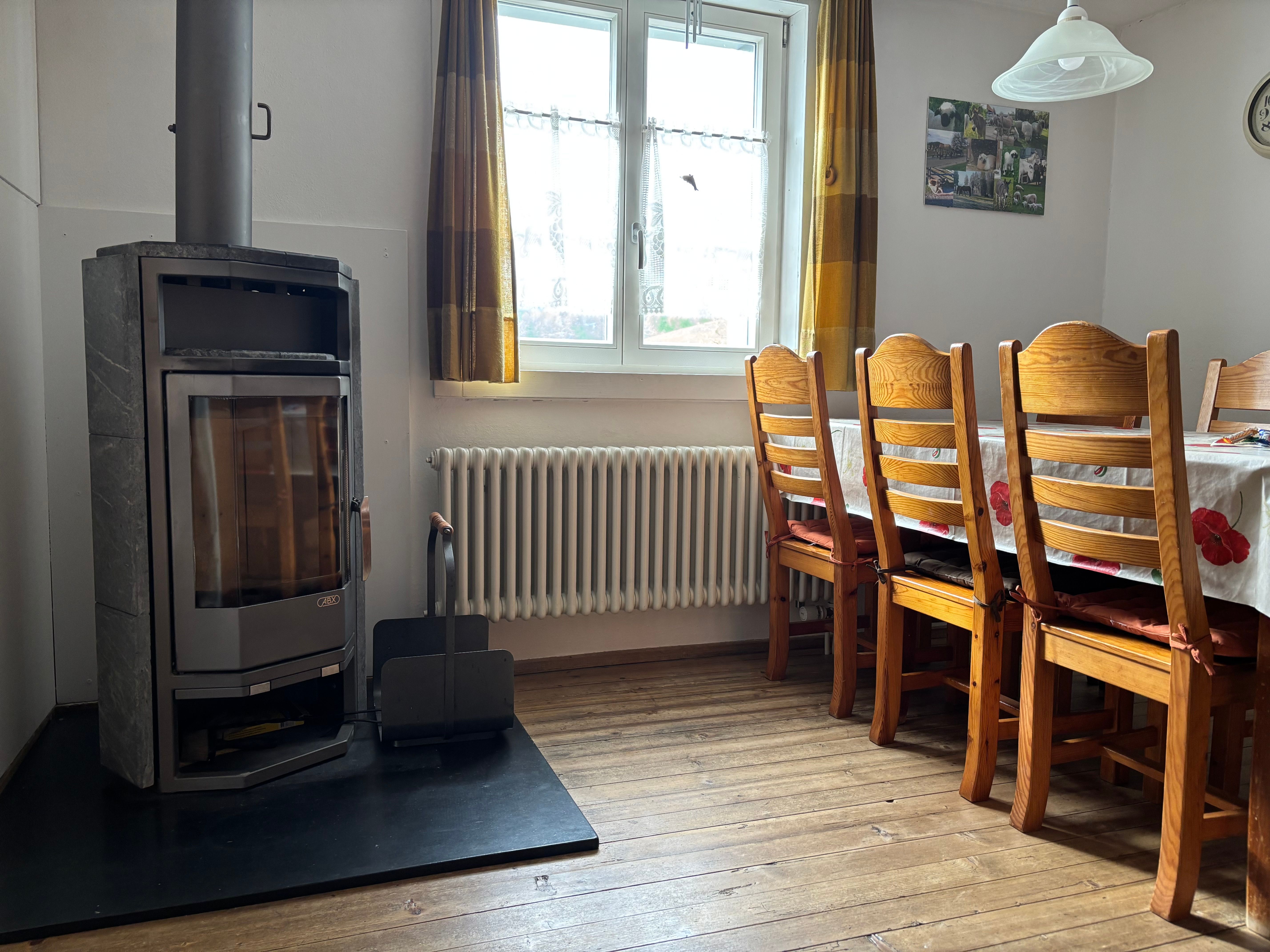 Wohnzimmerausstattung: 2 Sofas, Couchtisch, TV, Radio, Kommode, Schrank, Esstisch mit Stühlen für 6-8 Personen, Kinderhochstuhl, Kaminofen.