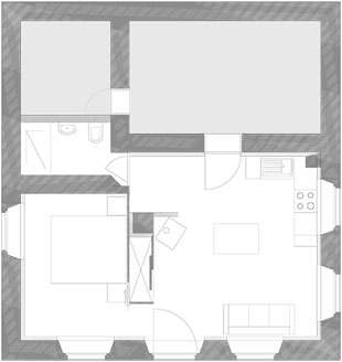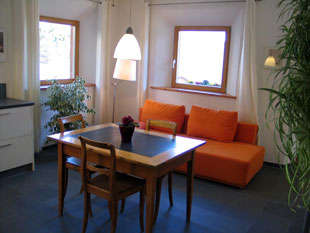 Diese besteht aus einem Wohnraum mit Cheminéeofen und kleiner Bibliothek, einem Schlafraum, einer modern ausgebauten Küche und einem Badezimmer mit Regendusche. Die ganze Wohnung ist mit Parkett und Schieferböden ausgelegt.