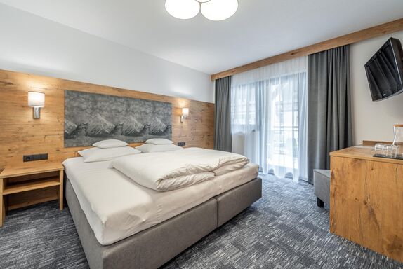 Gemütliches neu renoviertes Komfortzimmer mit einem Boxspringbett mit Dusche/WC, Flat-TV, Safe und Balkon.