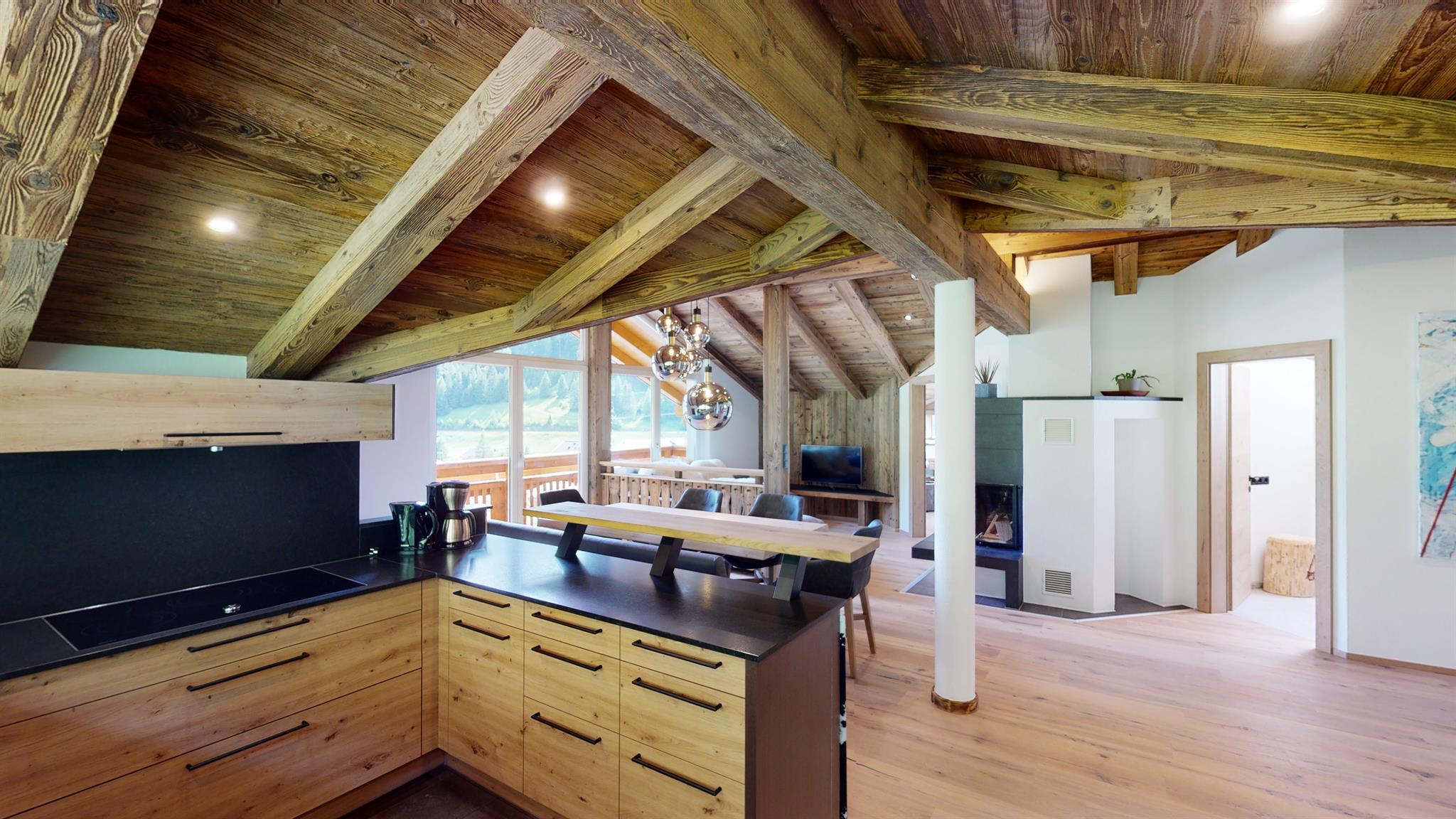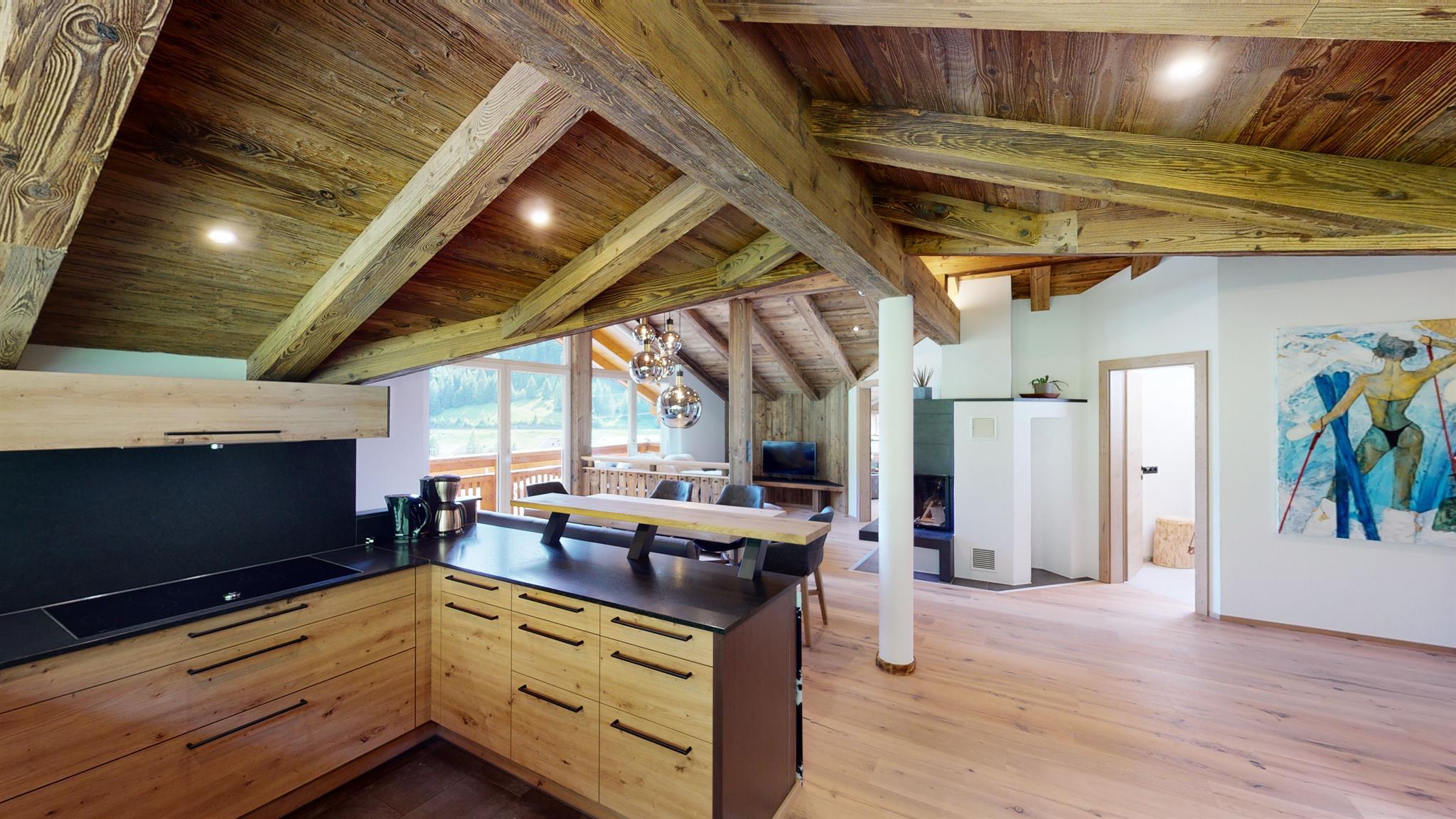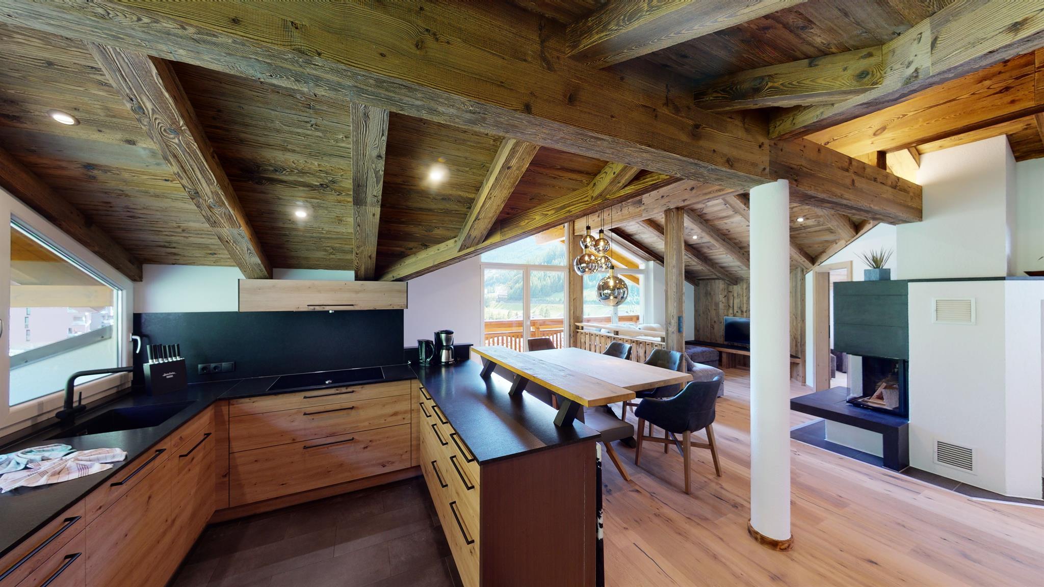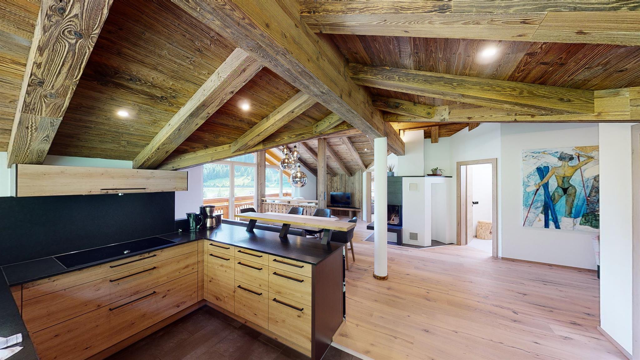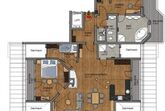 Appartement mit Sichtdachstuhl und ca. 120 m²: 2 Doppelzimmer, 1 Zweibettzimmer mit Stockbett, 1 Badezimmer mit Dampfdusche und Badewanne, 1 Badezimmer mit Dusche, 2 separate Toiletten, großes Wohnzimmer mit Esstisch und Sofalandschaft (ausziehbar für 2 Personen), Flat-TV, Designer-Küche mit Induktions-Herd und Mikrowelle, Geschirrspülmaschine, Kaffeemaschine, Garderobe, Süd-, Ost- und West-Balkon.
