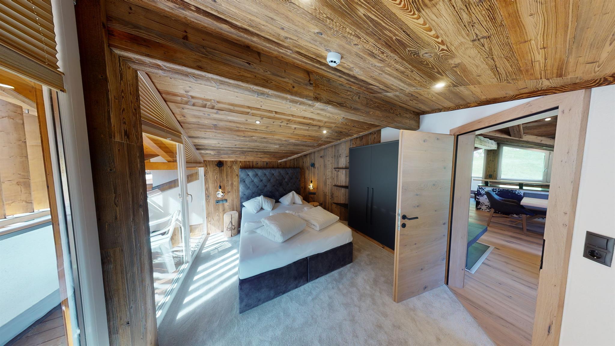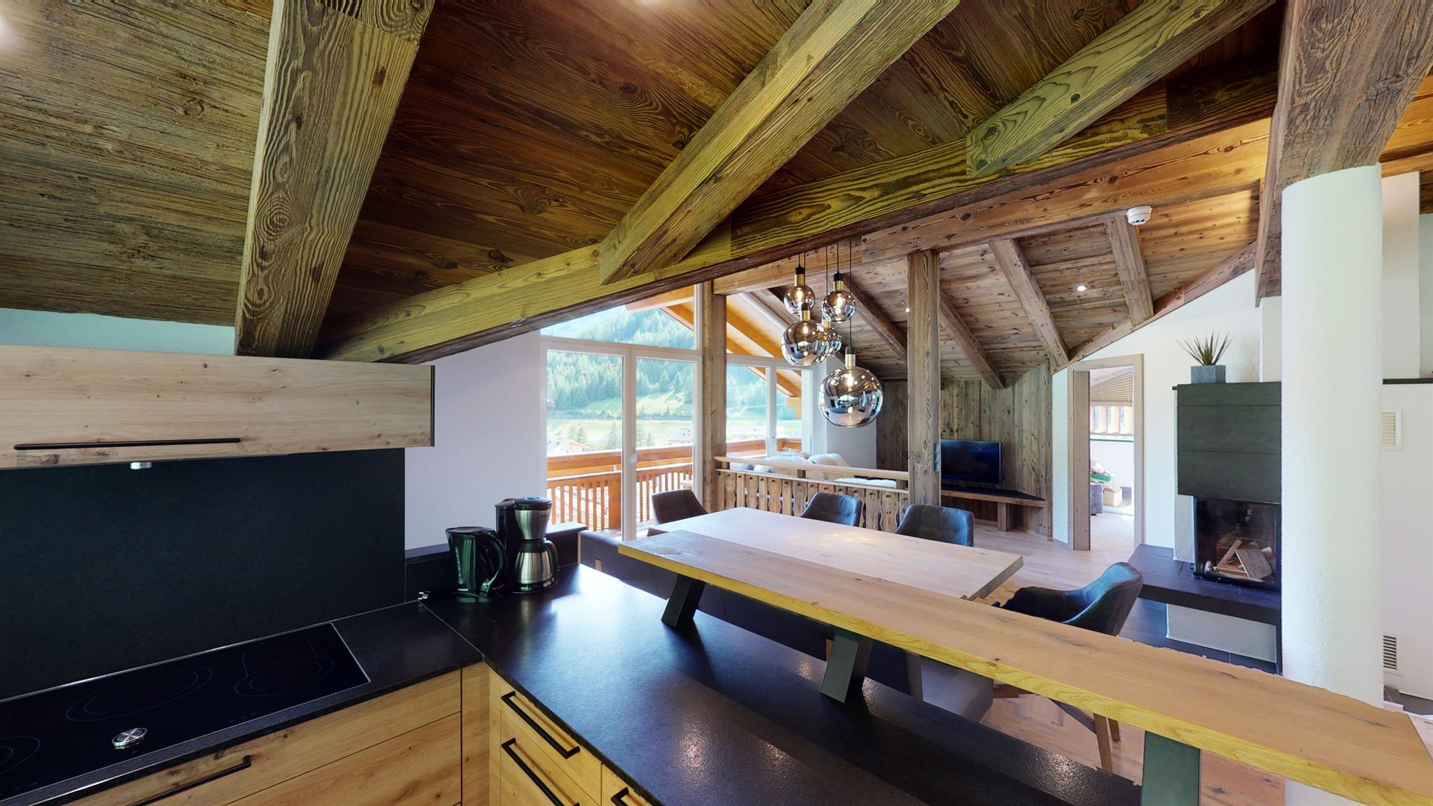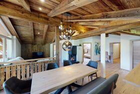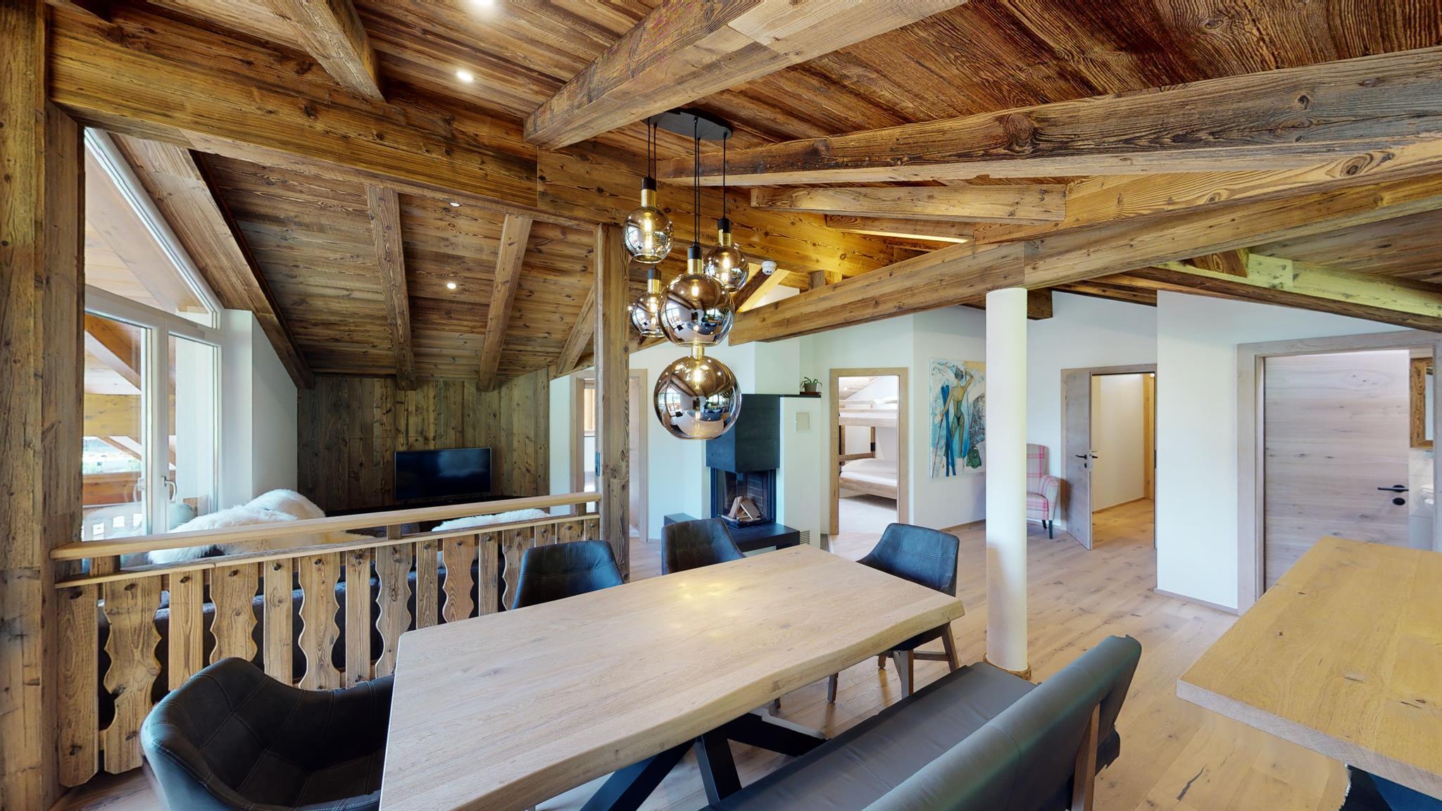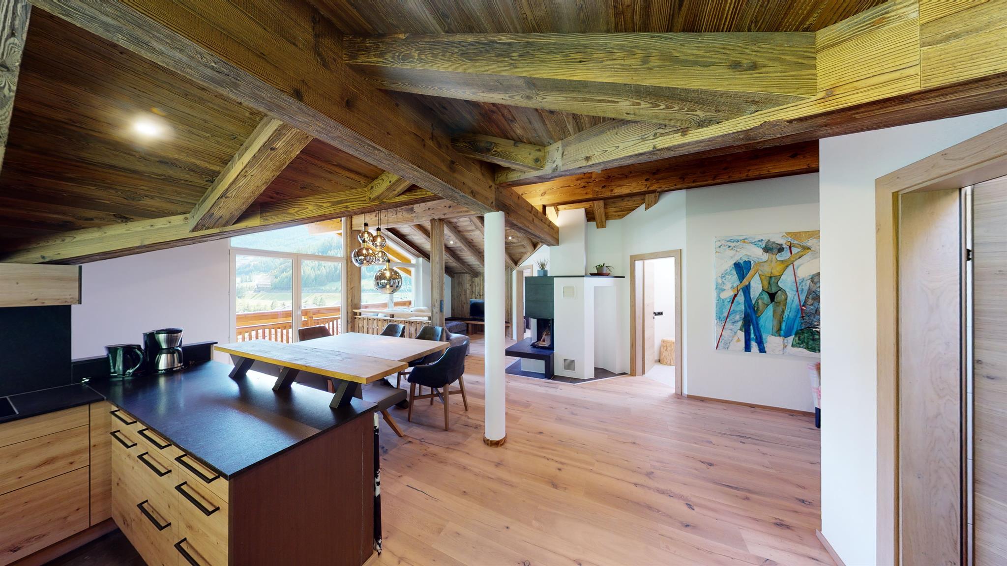 Appartement mit Sichtdachstuhl und ca. 120 m²: 2 Doppelzimmer, 1 Zweibettzimmer mit Stockbett, 1 Badezimmer mit Dampfdusche und Badewanne, 1 Badezimmer mit Dusche, 2 separate Toiletten, großes Wohnzimmer mit Esstisch und Sofalandschaft (ausziehbar für 2 Personen), Flat-TV, Designer-Küche mit Induktions-Herd und Mikrowelle, Geschirrspülmaschine, Kaffeemaschine, Garderobe, Süd-, Ost- und West-Balkon.