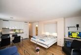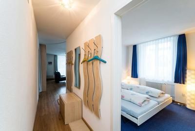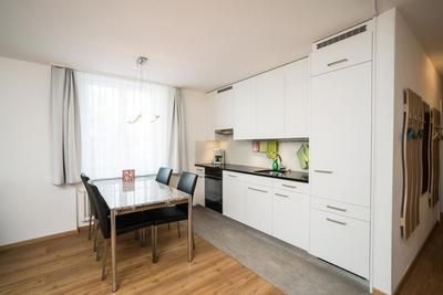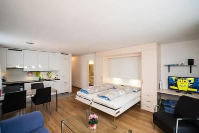 Die Innenausstattung der Wohnung ist auf höchsten Komfort ausgelegt. Sie verfügt über ein gemütliches Schlafzimmer mit Doppelbett und ein Wohnschlafzimmer mit einem Doppelschrankbett sowie die Möglichkeit, ein Zusatzbett hinzuzufügen. Eine moderne eingebaute Küche mit großem Kühlschrank, Geschirrspüler, Backofen, Mikrowelle, Kaffeemaschine inkl. Nespresso-Kaffeemaschine und einem Wasserkocher – alles Produkte Schweizer Fabrikation – lässt keine Wünsche offen. Ein neues Bad mit großer Dusche, WC und Bodenheizung sowie Zugang zu Waschmaschine und Tumbler (gegen Aufpreis) runden das Angebot ab. Für Entertainment sorgen Sat TV und kostenloses Wireless LAN.