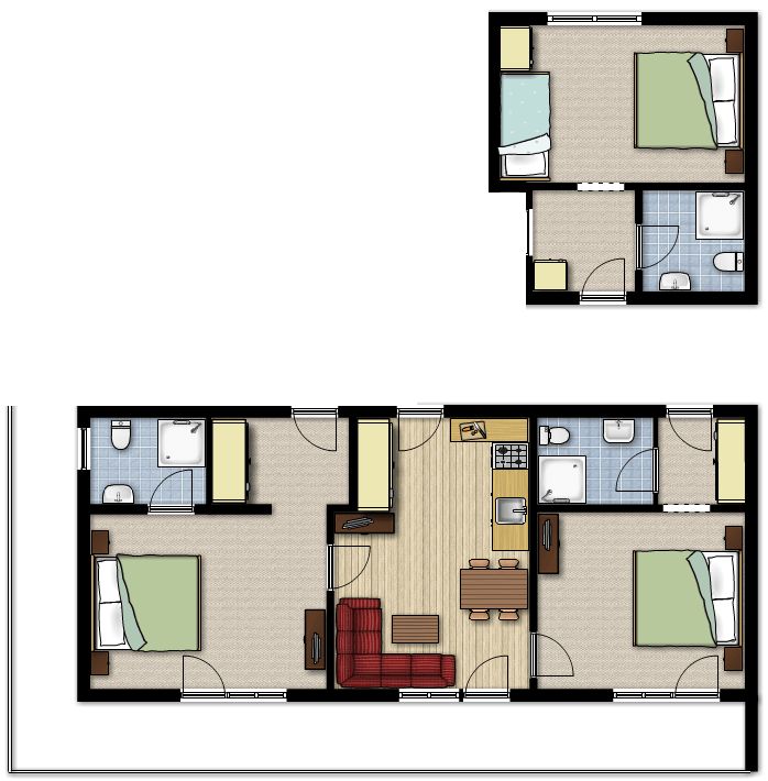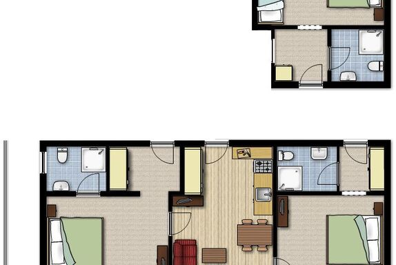 3 Doppelzimmer jeweils mit SAT-TV, 3 Bäder mit Dusche/WC, Haartrockner, Balkon mit Sicht nach Osten und Süden auf die Ötztaler Bergwelt. Große Wohnküche mit Schlafsofa, Esstisch & SAT-TV sowie voll ausgestattete Küche mit Backofen, Geschirrspüler, Glaskeramikherd mit 4 Platten, Kühlschrank (ohne Gefrierfach), Toaster, Wasserkocher, Mikrowelle, Kaffeemaschine. Das 3. Doppelzimmer befindet sich außerhalb des Appartements (eine Etage höher).