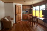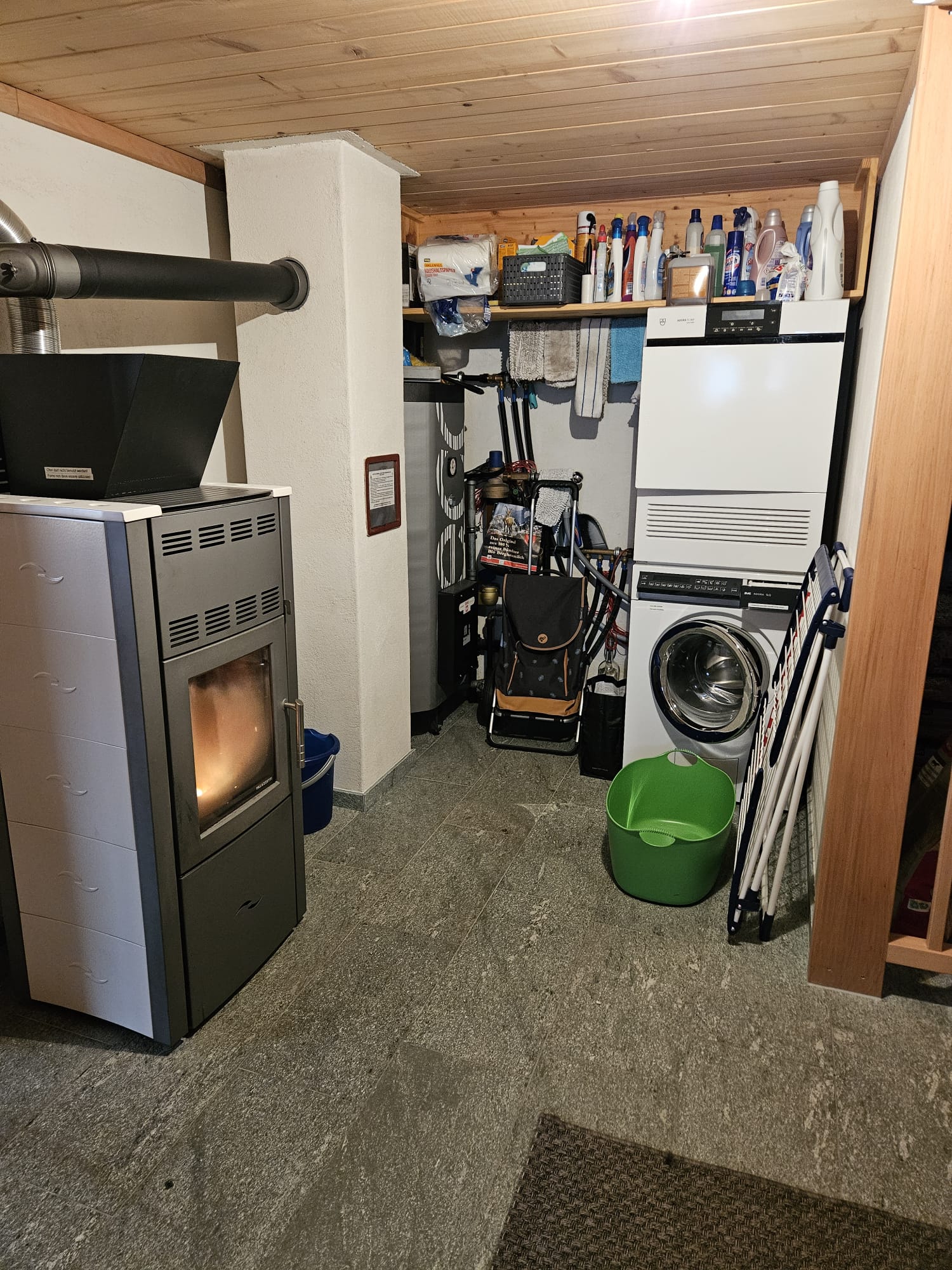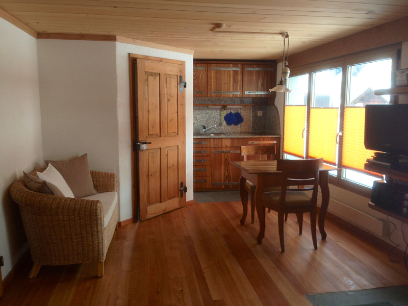 1 Zimmer Studio im EG gemütlich eingerichtet. Studio mit Doppelbett, kleine offene Kochnische mit 2-Platten-Rechaud, Kaffeemaschine (Nespresso), kleiner freistehender Backofen, Dusche/WC, Elektroheizung, TV/DVD, Radio, Waschmaschine, Tumbler.