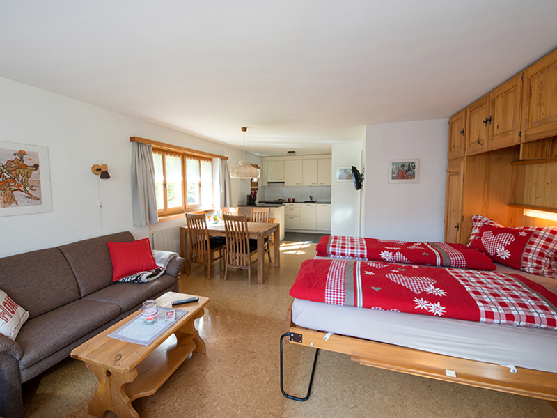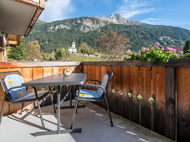 2.5-Zimmer-Wohnung im 1. Stock mit Balkon, komfortabel und gemütlich eingerichtet: Schlafzimmer mit 2 Betten, Wohn-/Esszimmer mit 2 bequemen Klappbetten, Bad-WC, offene Küche.
