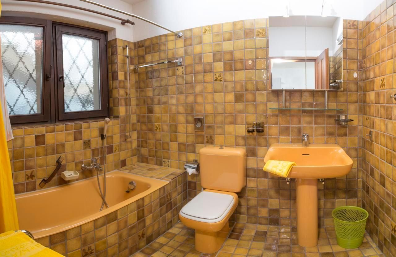 Das geräumige Bad/WC mit Badewanne zeichnet sich aus durch die handgefertigten Originalfliesen im italienischen Stil.