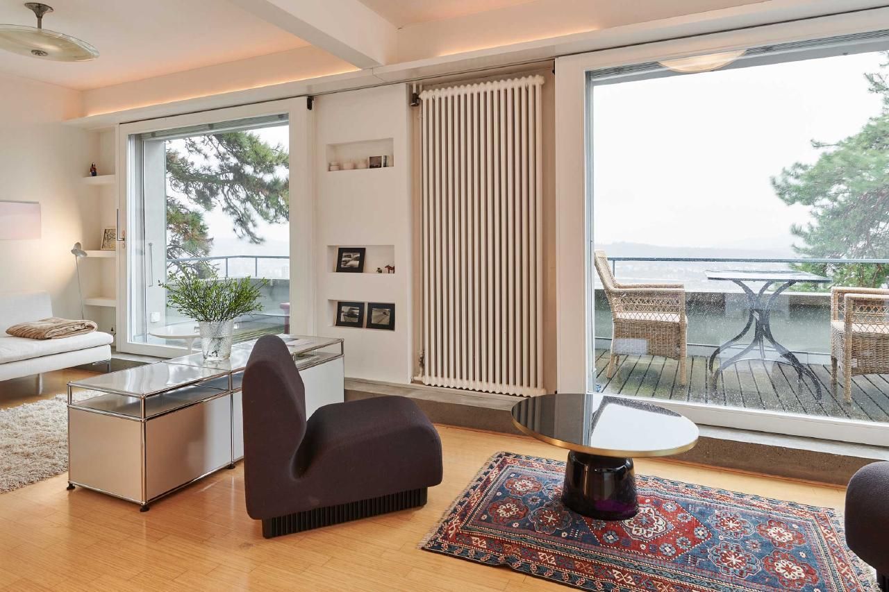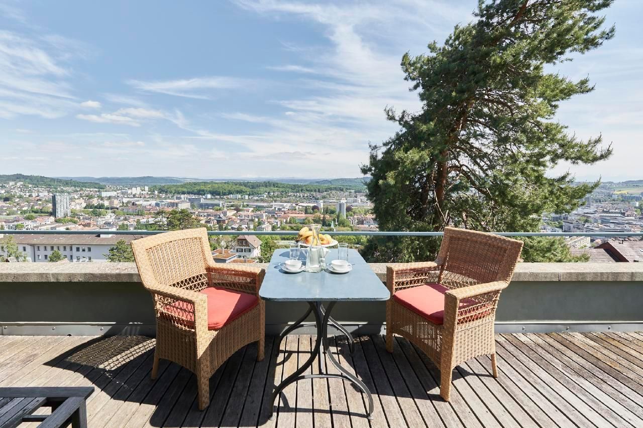 Aussenraum: Terrasse mit Sicht über die Stadt mit Tisch und Stühlen.