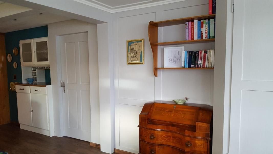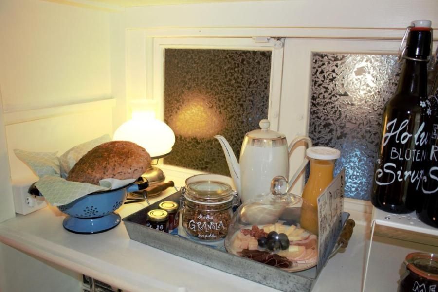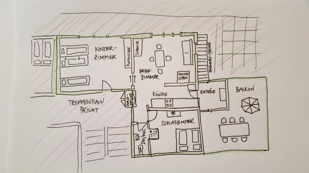 Wir haben die Wohnung mit einem restaurierten Küchenmöbel, von unserem Wohnbereich abgetrennt. Das gute Möbelstück haben wir umfunktioniert, damit man durch das Kästli kommunizieren kann (beide Seiten können öffnen) und wir euch über die Durchreiche das Frühstück (auf Bestellung) bereitstellen können. Es ist uns wichtig, dass ihr als Gäste die uneingeschränkte Privatsphäre habt und trotzdem ganz unkompliziert mit uns in Kontakt treten könnt.