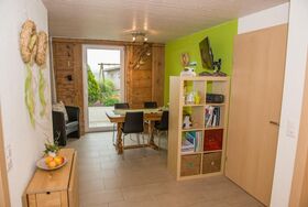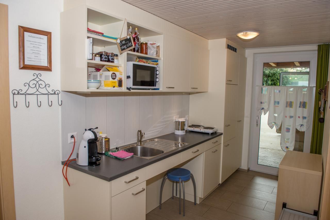 Die Wohnung zeichnet sich durch ihre barrierefreie Bauweise aus. Neben dem gemütlichen Einzelzimmer, steht Ihnen ein Aufenthaltsraum mit Verpflegungsmöglichkeiten zur Verfügung. Der Raum lädt zum Entspannen ein und bietet einen direkten Ausgang zum idyllischen Gartensitzplatz.