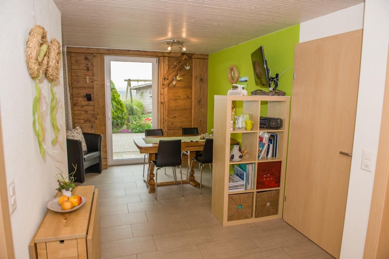 Im Außenbereich lockt nicht nur der Gartensitzplatz mit seiner Spielwiese, sondern auch die umgebende Natur mit Grillplätzen im Dorf und im Wald. Unsere kleinen Gäste erfreuen sich an Spielzeugen und einem Spielplatz auf und in der Nähe des Hofes.