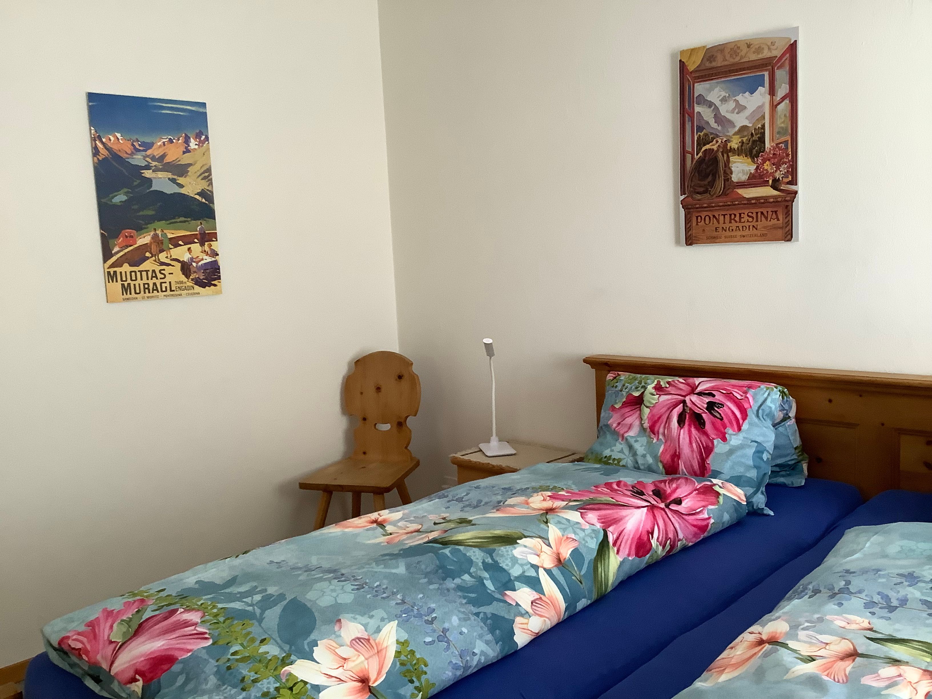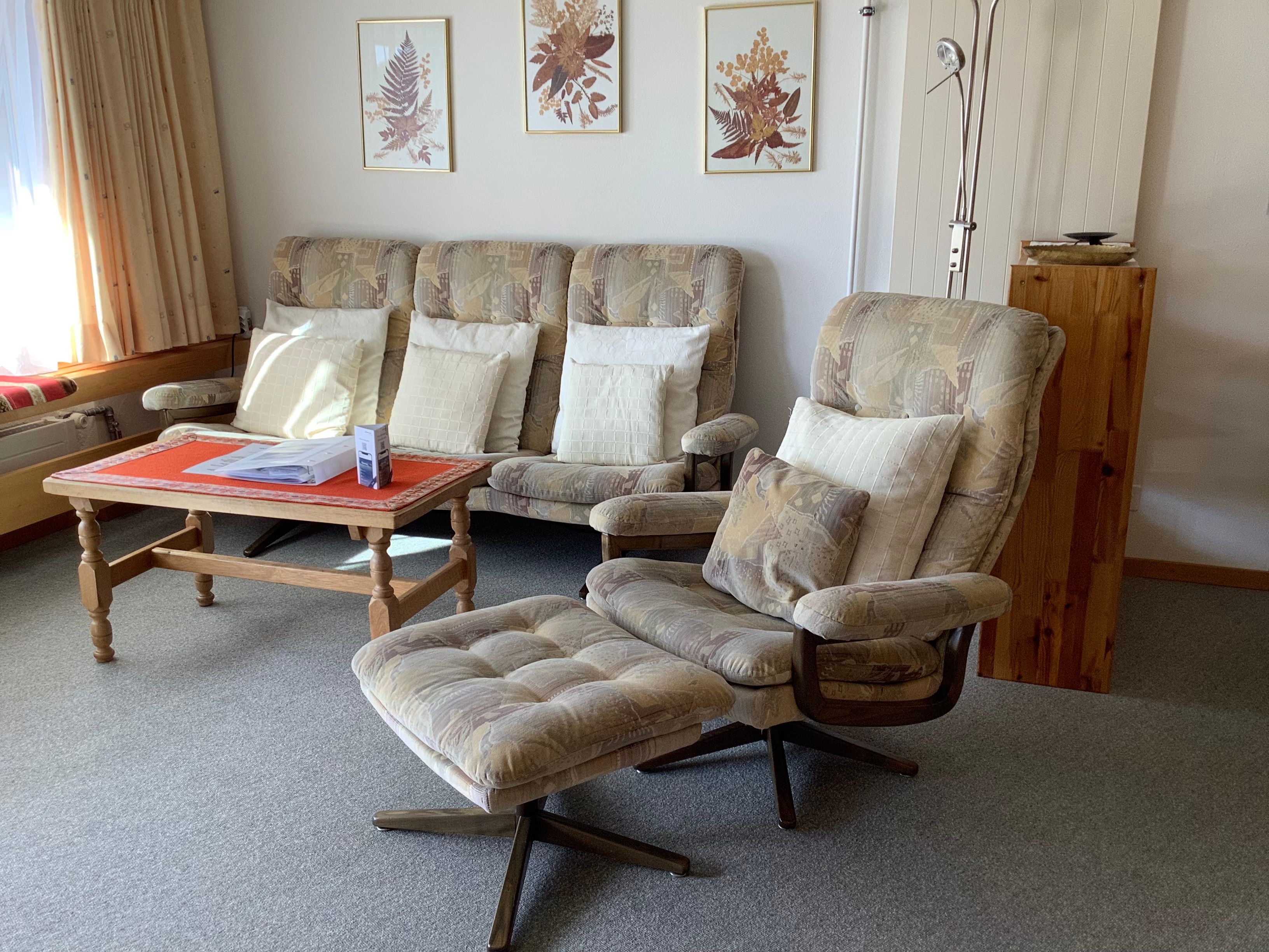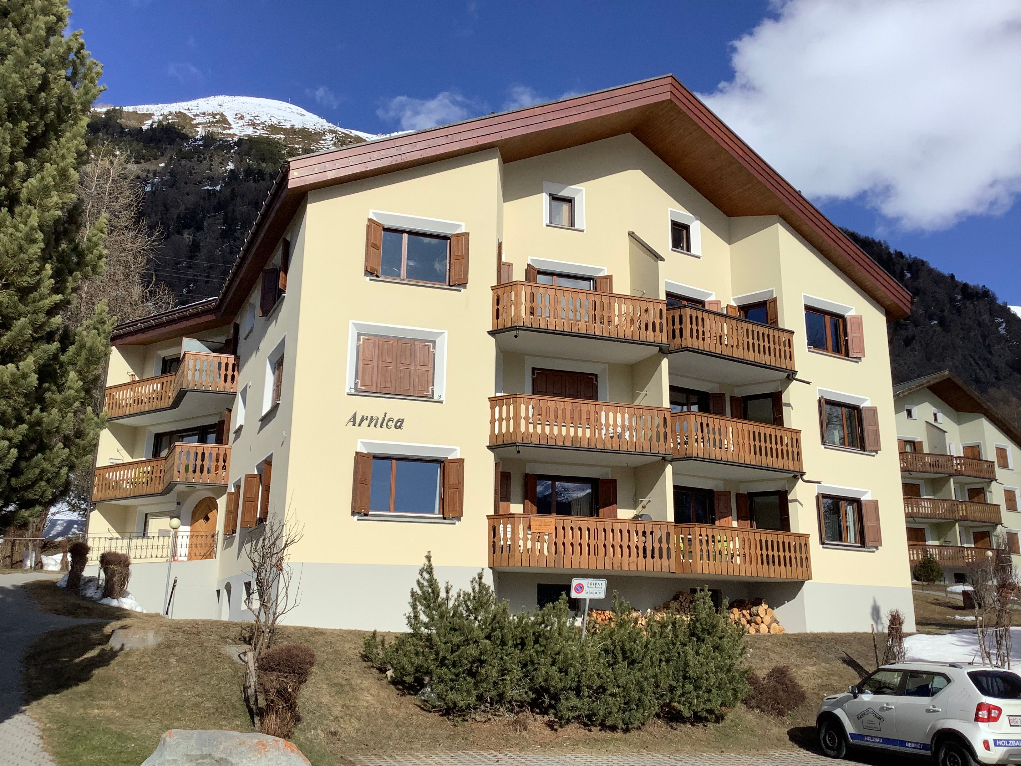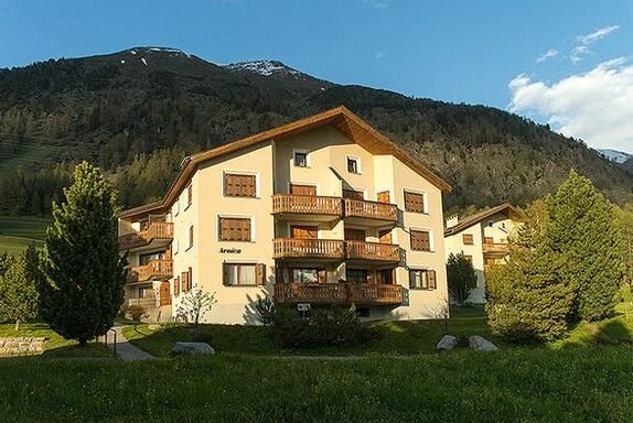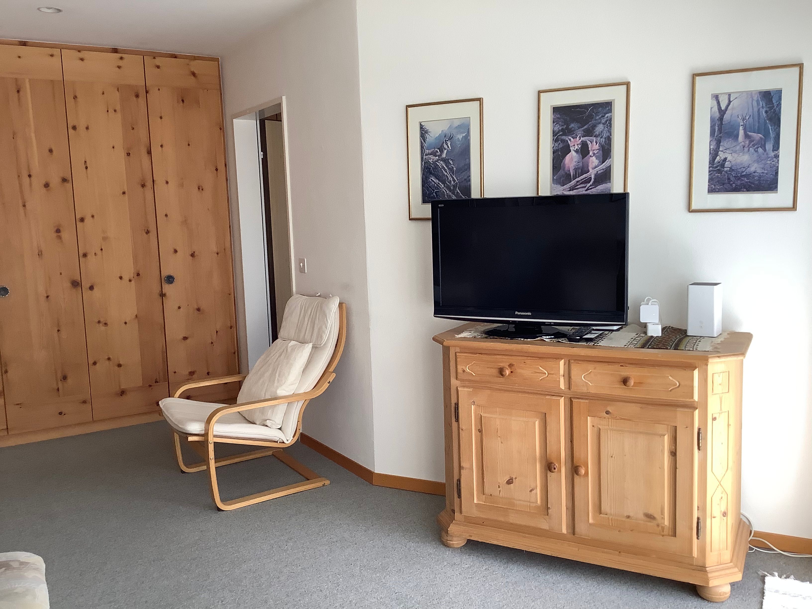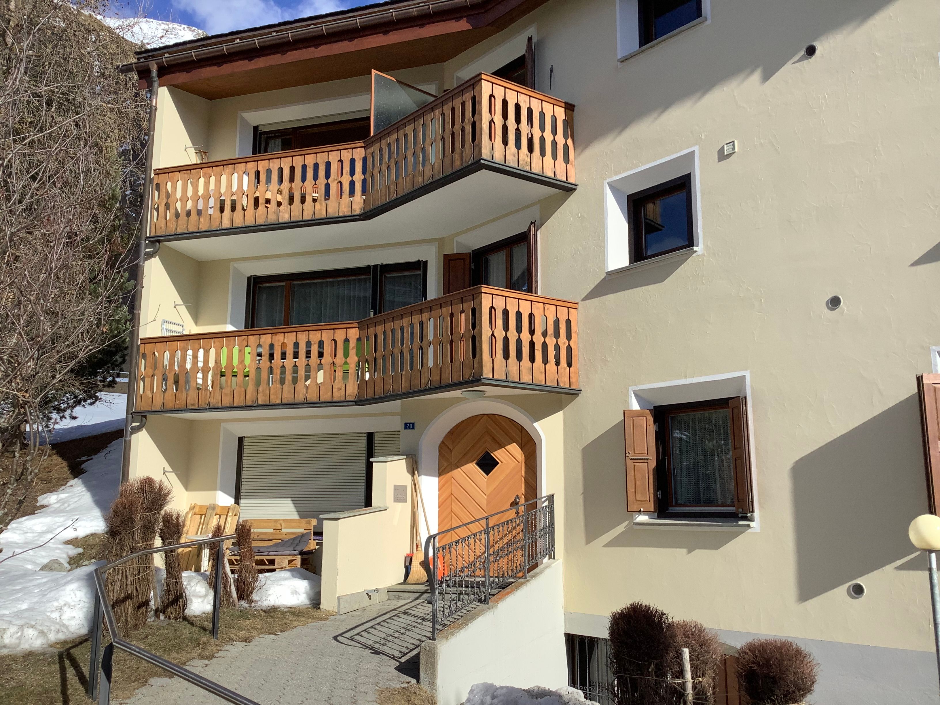 Sehr schöne, geräumige, mit viel Arvenholz gemütlich eingerichtete 2 1/2 Zimmerwohnung (65m2) im 1.Stock. Ruhig gelegen. Das Wohnzimmer bietet mit einer gemütlichen Couch, 2 Fernsehsesseln, Swisscom TV und WLAN, Raum zum Entspannen. Ein Balkon mit Aussicht in die fantastische Bergwelt, vollständig möbliert mit Tisch und Stühlen, sowie Liegen und Sonnenschirm lädt zum Verweilen ein. Die offene, moderne Küche ist ausgestattet mit Glaskeramik Kochfeld, Geschirrspüler, Backofen, grossem Kühlschrank Kaffeemaschine, Kapselsystem (Nespresso), Filterkaffeemaschine, Wasserkocher, Microwelle, Fonduegeschirr und Raceletteofen. Ein runder Esstisch mit Eckbank lädt zum gemütlichen Zusammensitzen ein. Das Schlafzimmer mit Doppelbett (2 x 90 x 200), Einbauschrank und direktem Zugang zum Balkon, bietet grosszügigen Raum für entspannte Nachtruhe. Ein 3. Bett findet sich in einer etwas abgetrennten Nische im Vorraum. Das Badezimmer bietet mit Dusche, abgetrenntem WC und einem Doppelwaschtisch grossen Komfort auf kleinem Raum. Gemeinsame Velo-und Skiräume sowie eine Waschmaschine finden sich im Keller im Haus. Ein Aussenparkplatz steht zur Verfügung. Die Nähe zur Bushaltestelle bietet den idealen Ausgangspunkt für Ihre Unternehmungen. Wandern, Biken, Skifahren, Langlaufen beginnt direkt vor der Haustüre. Im Winter erreichen Sie die Loipen bequem zu Fuss.