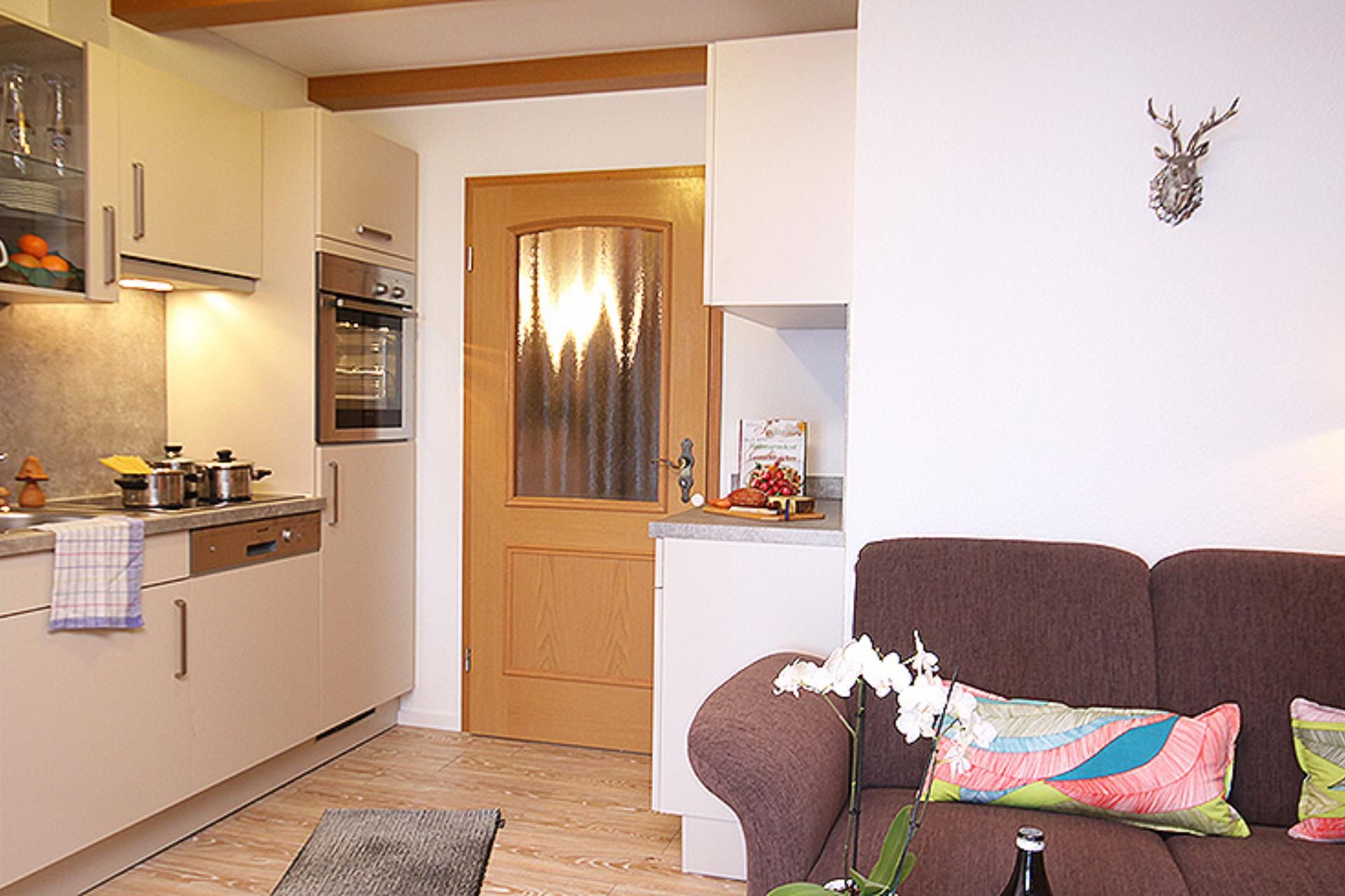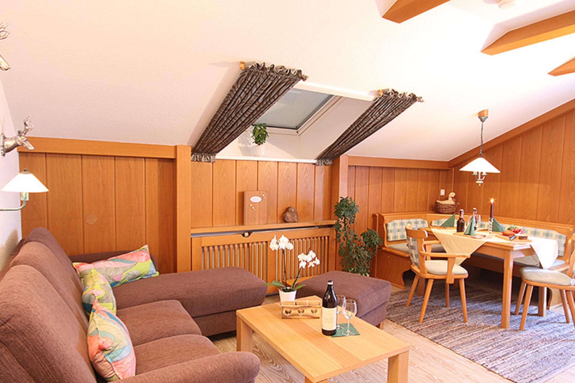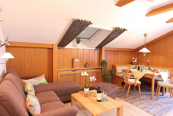 Gemütlich, im modernen alpenländischen Stil mit viel Liebe zum Detail ausgestattet, heißt Sie unsere frisch renovierte Ferienwohnung Hörnle willkommen. Der geräumige Wohnraum lädt zu geselligen Abende ein.