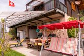 Küche mit grossem angrenzenden Aufenthaltsraum, Dusche/WC sowie einen grossen Gartensitzplatz, der zum Teil überdeckt ist. Die Räumlichkeiten sind bestens geeignet für Familienferien, Ferien mit Haustieren und für Wandergruppen.