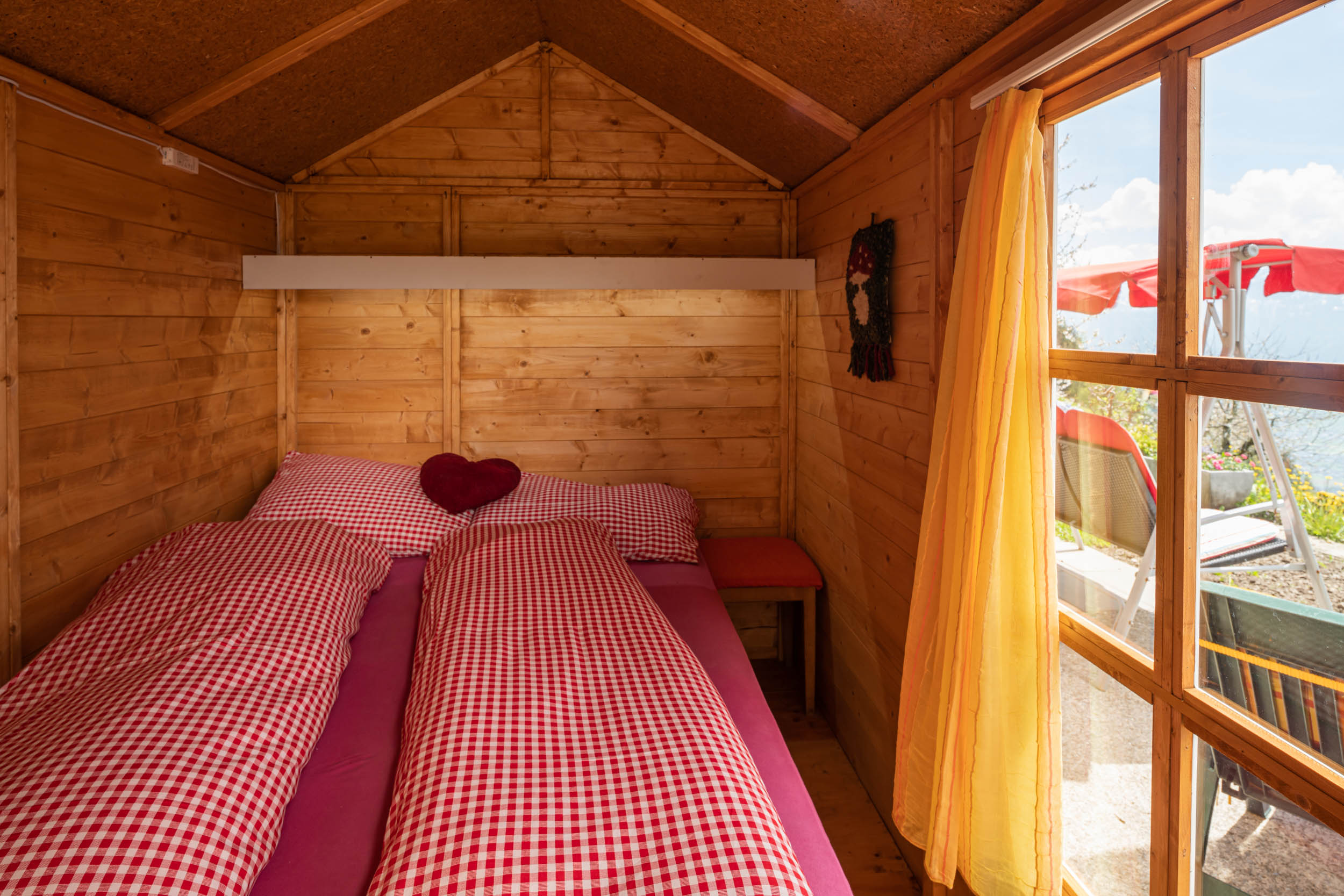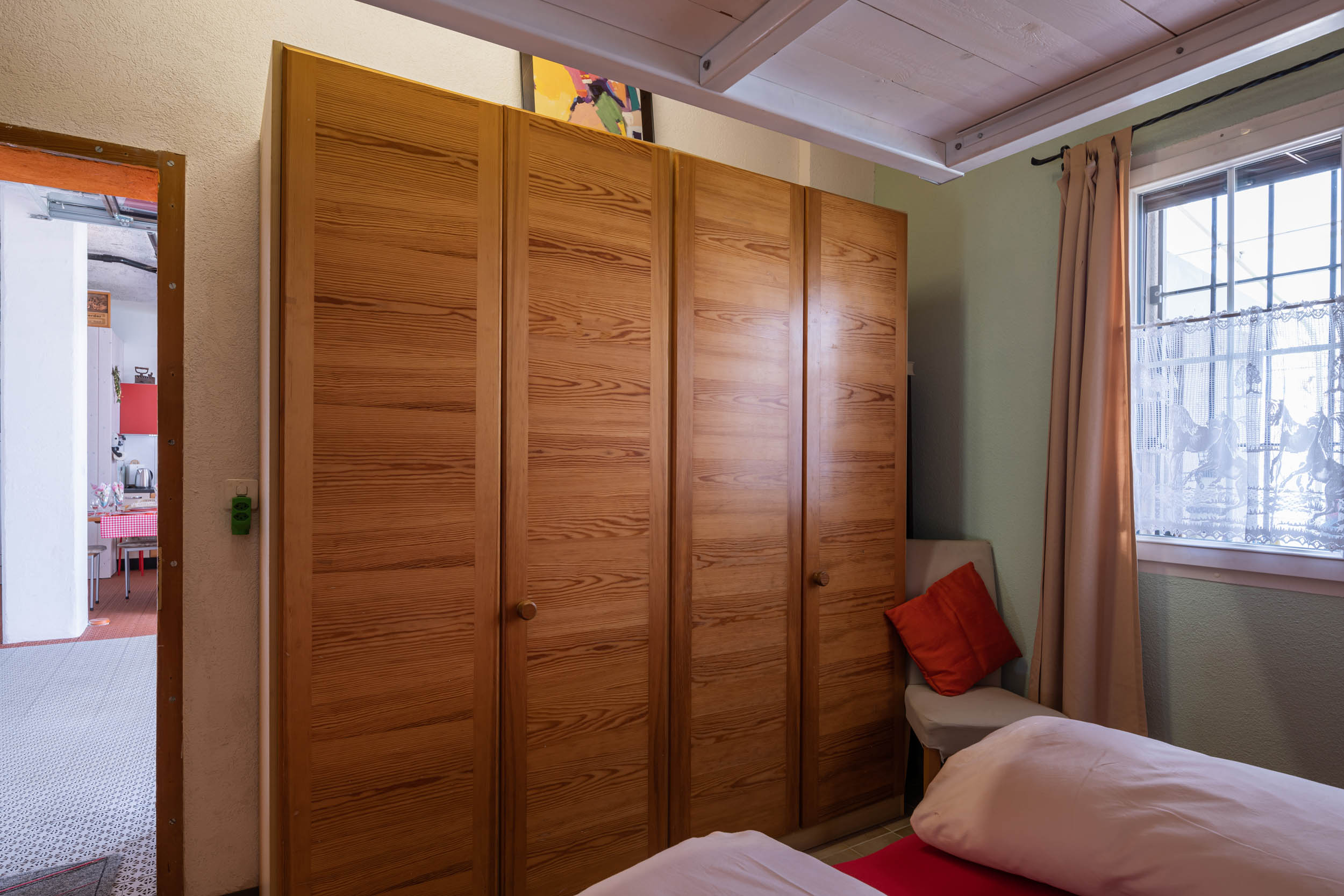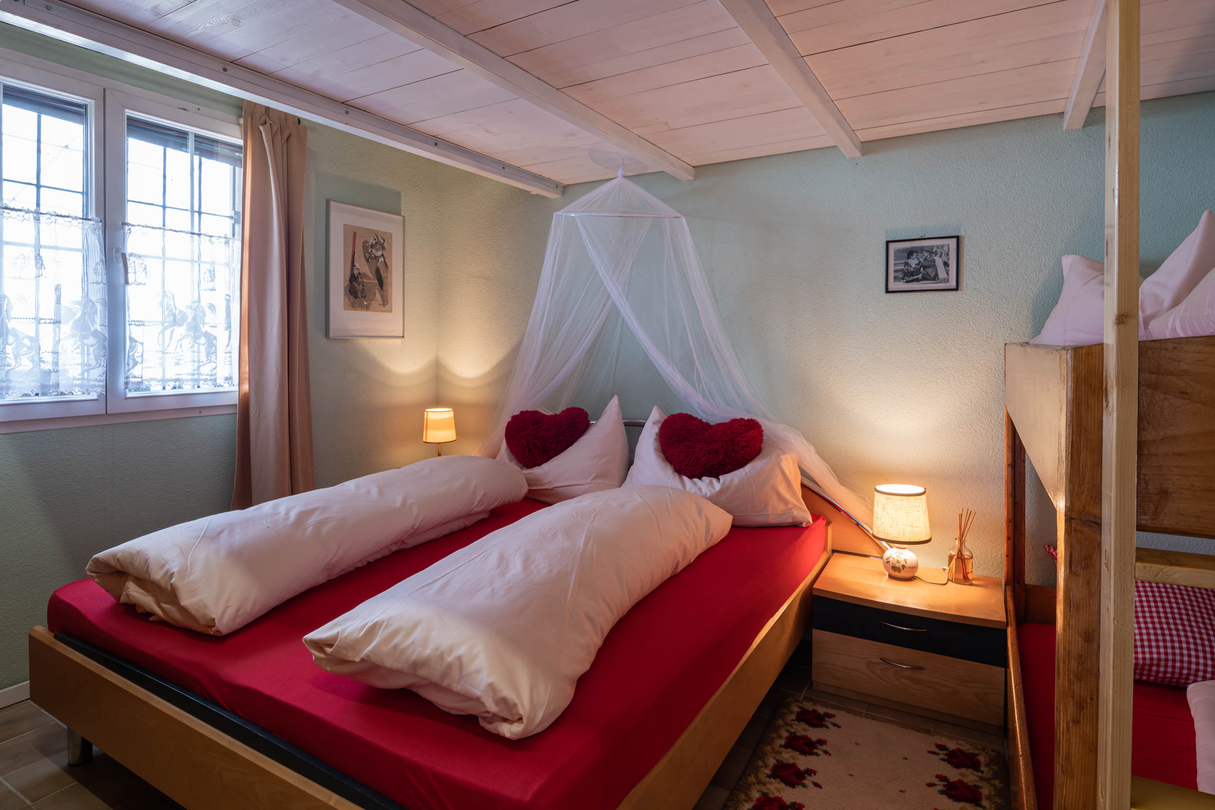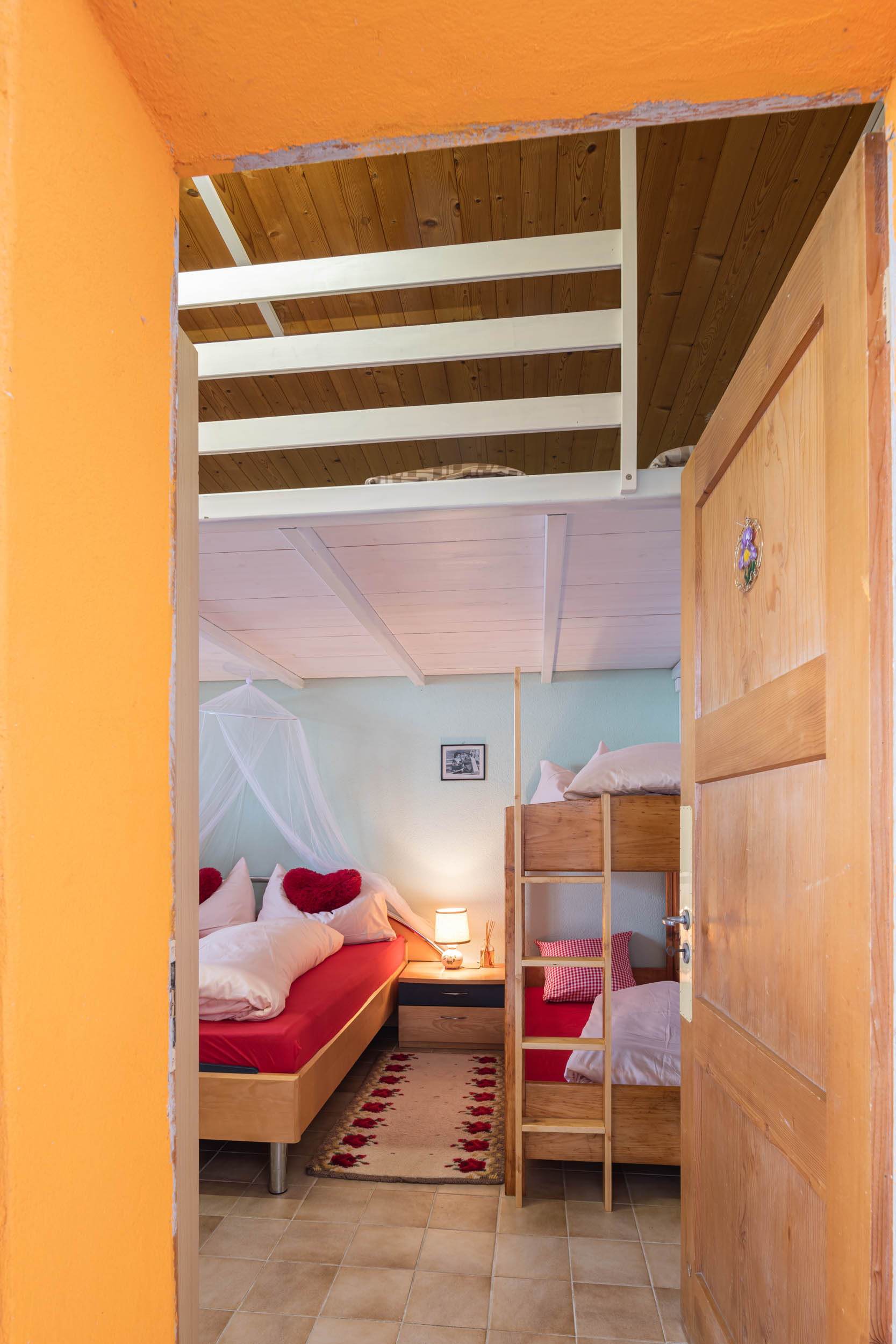 Schlafzimmer mit einem Doppelbett, einem Etagenbett und 4 Matratzen auf einer Galerie (total 8 Personen). Eine zusätzliche Schlafgelegenheit für 2 Personen bietet das Gartenhaus direkt vor dem Eingang zur Wohnung.