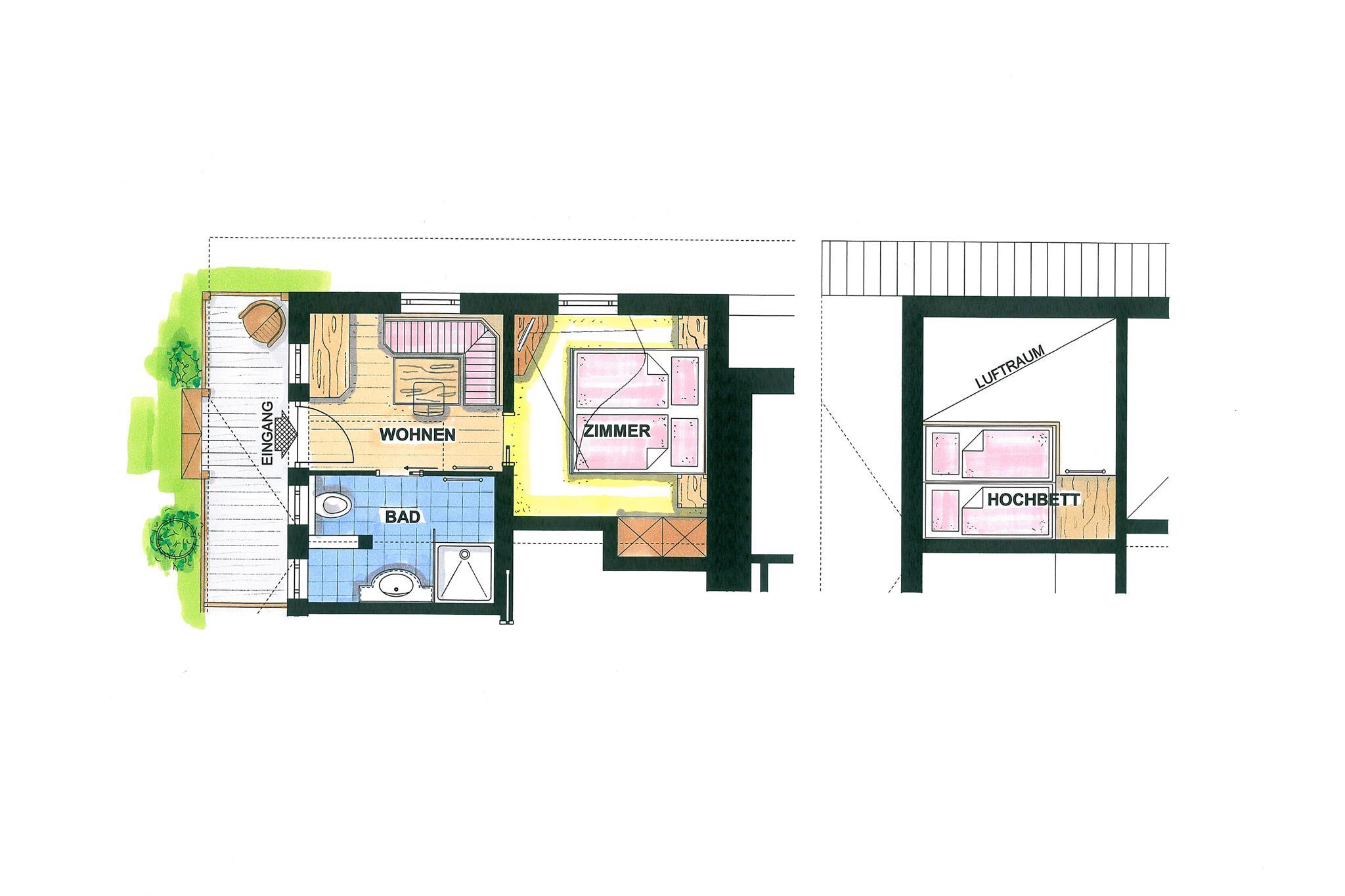 Kuschelzimmer wie aus dem Bilderbuch. Für bis zu 3 Personen. Mit gemütlichem Wohnraum, 1 Doppelbettzimmer und Emporenbett über dem Wohnraum. Inklusive Dusche/WC, Sat-TV, Radio, Kühlschrank, Zimmersafe und Internet-Anschluss.