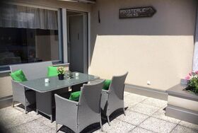 • Terrasse (ca. 15 m2) mit Esstisch und Stühlen, Liegestuhl