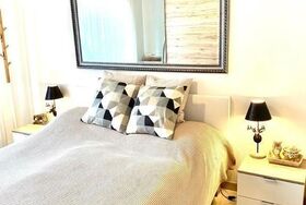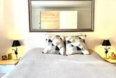 Schlafzimmer für 2 Personen mit Boxspringbett - Matratze 2 mittelhart und 180cm breit, warmen Duvets und Auswahl von Kissen. Babybett/Hochstuhl/Wickelunterlage auf Anfrage.