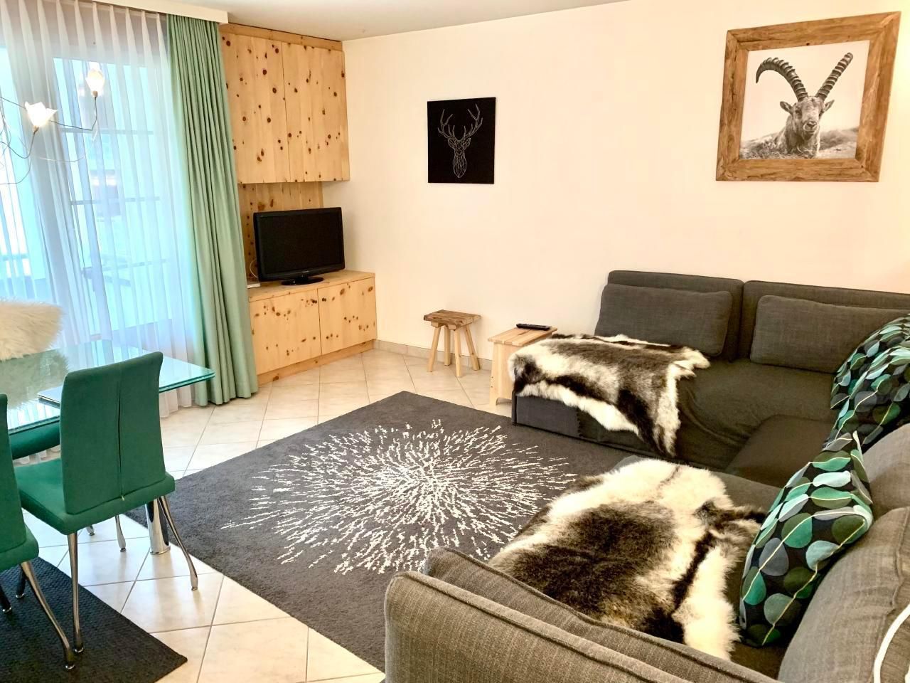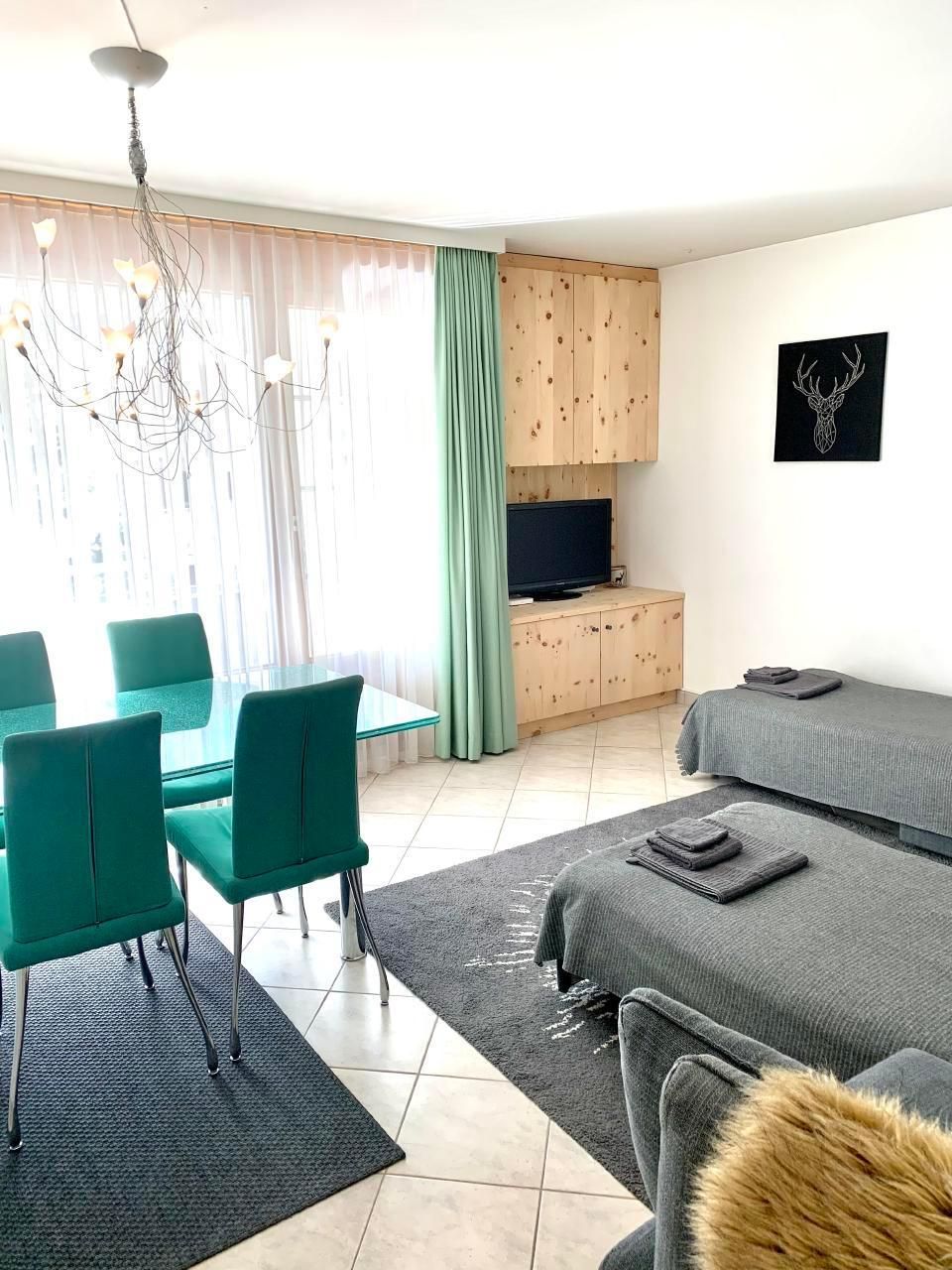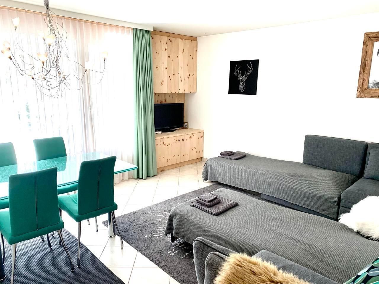 Wohn-/Esszimmer mit 3 Ausziehbetten je 80 cm breit, eher für Kinder aber für 1-2 Nächte geht es gut mit Total 5 Erwachsene) und Kabel-TV (Flachbildschirm). Das Wohnzimmer hat weniger Platz wenn alle 3 Sofabetten ausgezogen sind, aber am Tag kann man sich zusammen tun um mehr Platz zu haben. Perfekt für eine Familie oder Gäste, die meisten draussen sind und zum Essen/Schlafen die Wohnung nutzen. Esstisch mit 5 Stühlen (Kinderhochstuhl auf Anfrage). Ausgang zum Balkon. Alles für Baby & Kleinkind kann im Voraus arrangiert werden. Zur Verfügung: Internet (WIFI, gratis). Bitte beachten: Nichtraucher-Unterkunft. Keine Haustiere. In unmittelbarer Nähe: Supermarkt (270m), Restaurants (270m), Take Away (270m), 2 Bushaltestellen (170m), Freibad (200m), Hallenbad (200m), Kongresszentrum (190m), Vaillant Arena (850m), Langlaufzentrum Davos (350m), Minigolf (450m), Davos Golf Club (850m), Parsennbahn (1.4km), Jakobshorn (1.7km), Tennis (2.4km), Landwasser (150m) Wir haben immer zufriedene Gäste und viele Stammgäste, die immer wieder kommen!