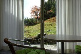Rustikale 1-Zimmer-Wohnung (30m2) für 2 Personen, 1. Etage, Richtung Süden, mit Wintergarten und Terrasse, Wohn/Schlafraum mit 2 Klappbetten, Küchenzeile mit 2 Herdplatten, mit Ofen, Filterkaffeemaschine und Fonduegeschirr, Radio, SAT-TV, Telefon, Bad/WC. W-Lan gratis.