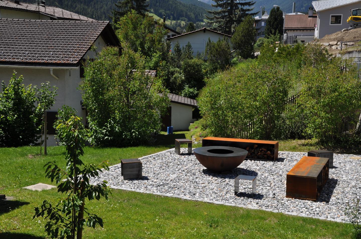 Zwei Südbalkone mit Panoramablick und der zusätzlich grosse Garten mit Tischtennistisch und Feuerstelle laden im Sommer zum verweilen ein. Die grosszügige Feuerstelle bringt mit lodernder Flamme atmosphärisches Lagerfeuer-Ambiente und ist bestens geeignet um Ihr Grillgut zu garen.