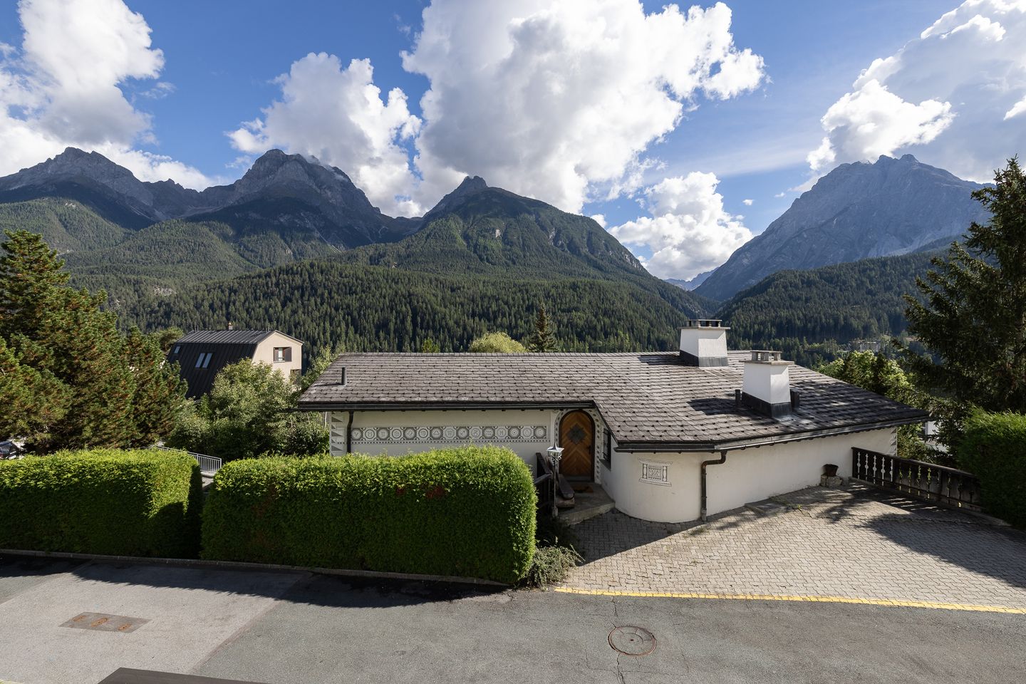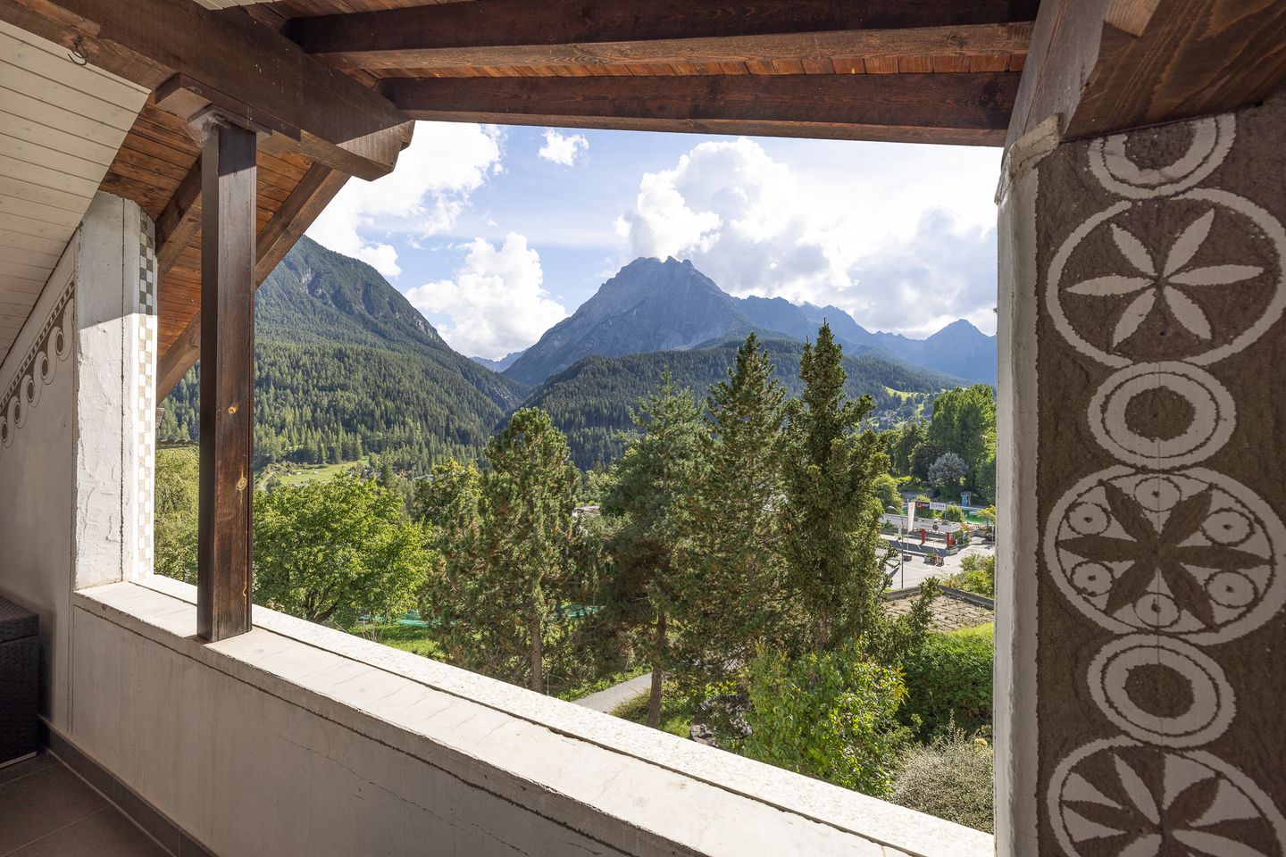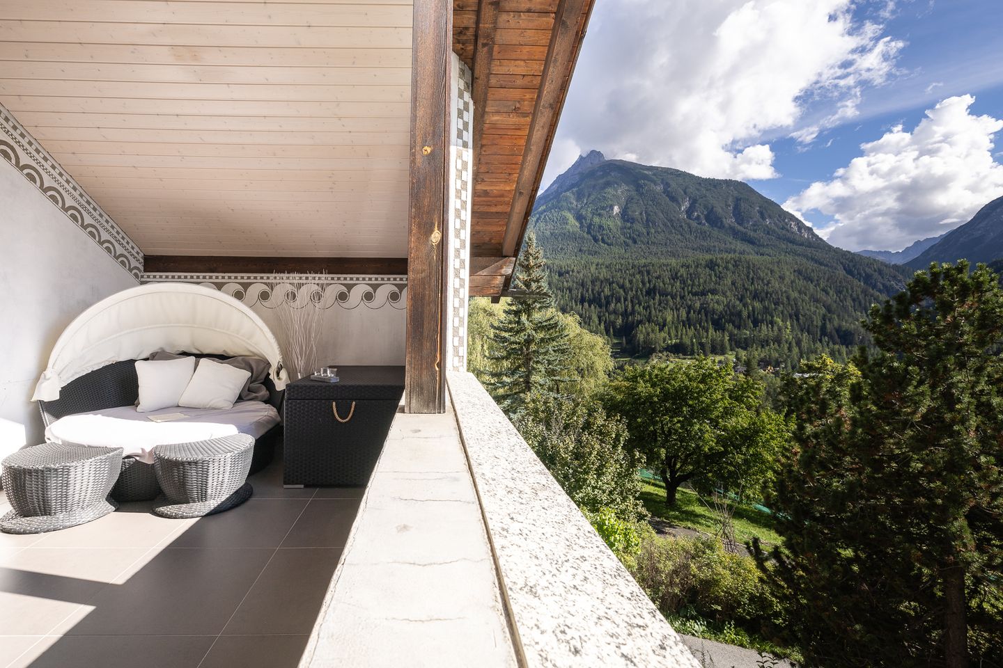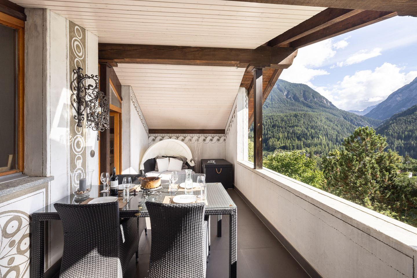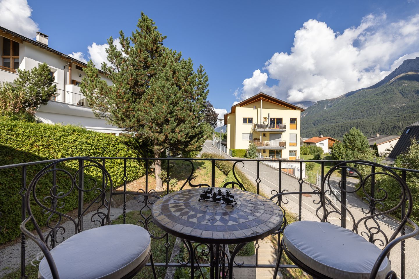 Eine bestens ausgestattete komfortable 3 1/2-Zimmerwohnung (2 Schlafzimmer – bis zu 4 Personen) im Dachgeschoss eines schönen Hauses im Engadinerstil, in zentraler Lage. Zum Dorfzentrum von Scuol, zur Talstation der Bergbahnen Motta Naluns und zum Bahnhof sind es nur jeweils ca. 5, 10 und 15 Gehminuten. Zwei private Parkplätze stehen vor dem separaten Wohnungseingang zur Verfügung. Die grosse gedeckte Südwest-Terrasse mit Esstisch, Lounge und Sonneninsel bietet einen tollen Panoramablick auf die Unterengadiner Bergwelt (und auf Schloss Tarasp) und lädt zum Verweilen ein.