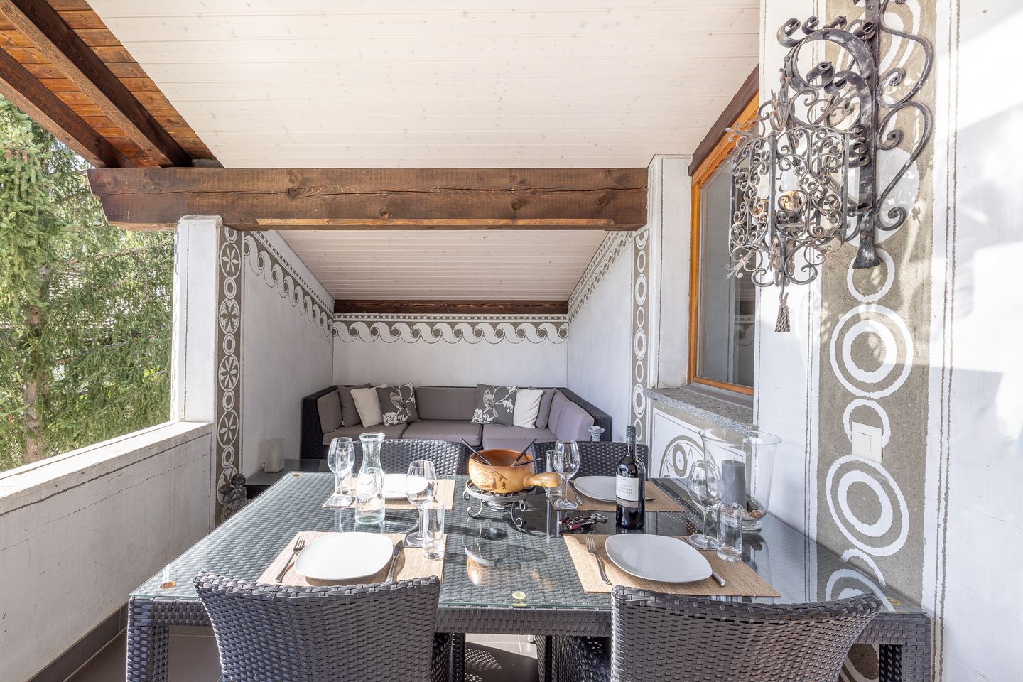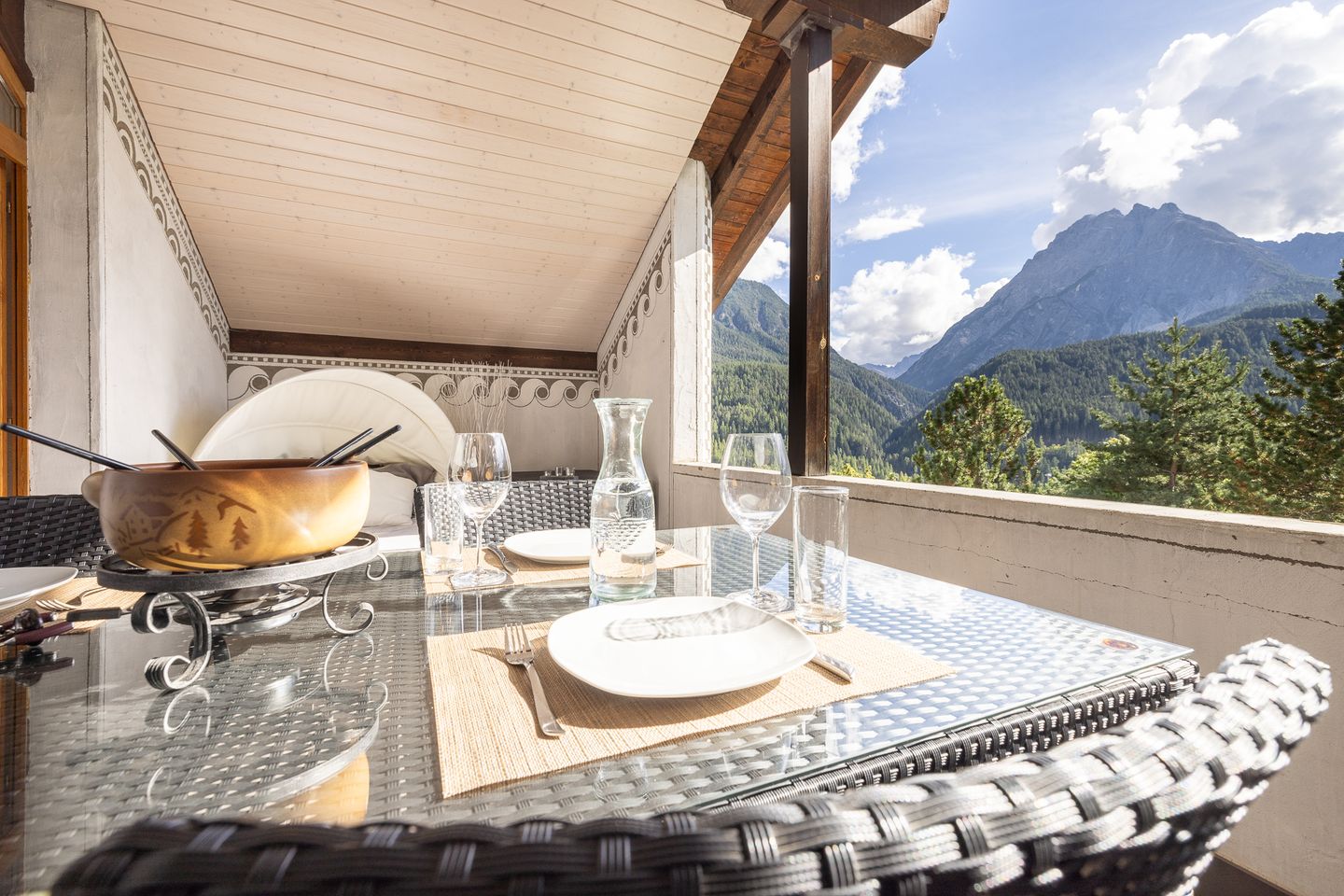 The large, south-west-oriented covered terrace, with a dining table, a sun-lounger and a cosy lounge area, provides a great view over the valley and the mountains, as well as Tarasp Castle. A great place to relax and enjoy the view !