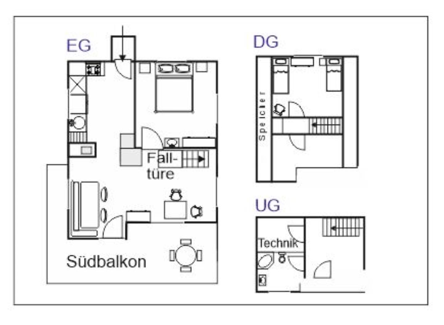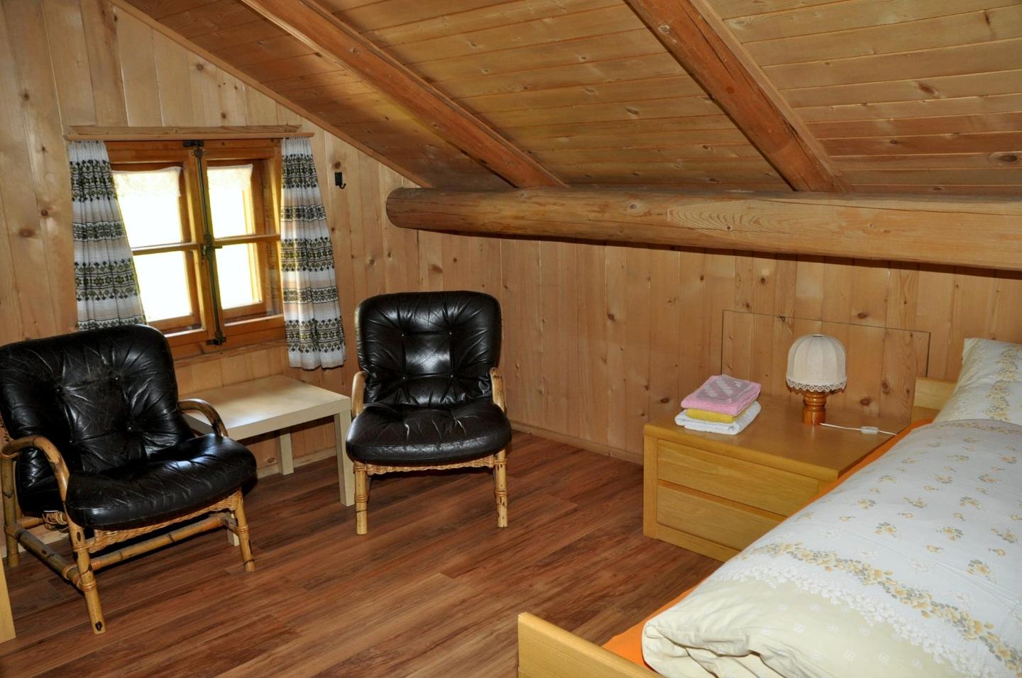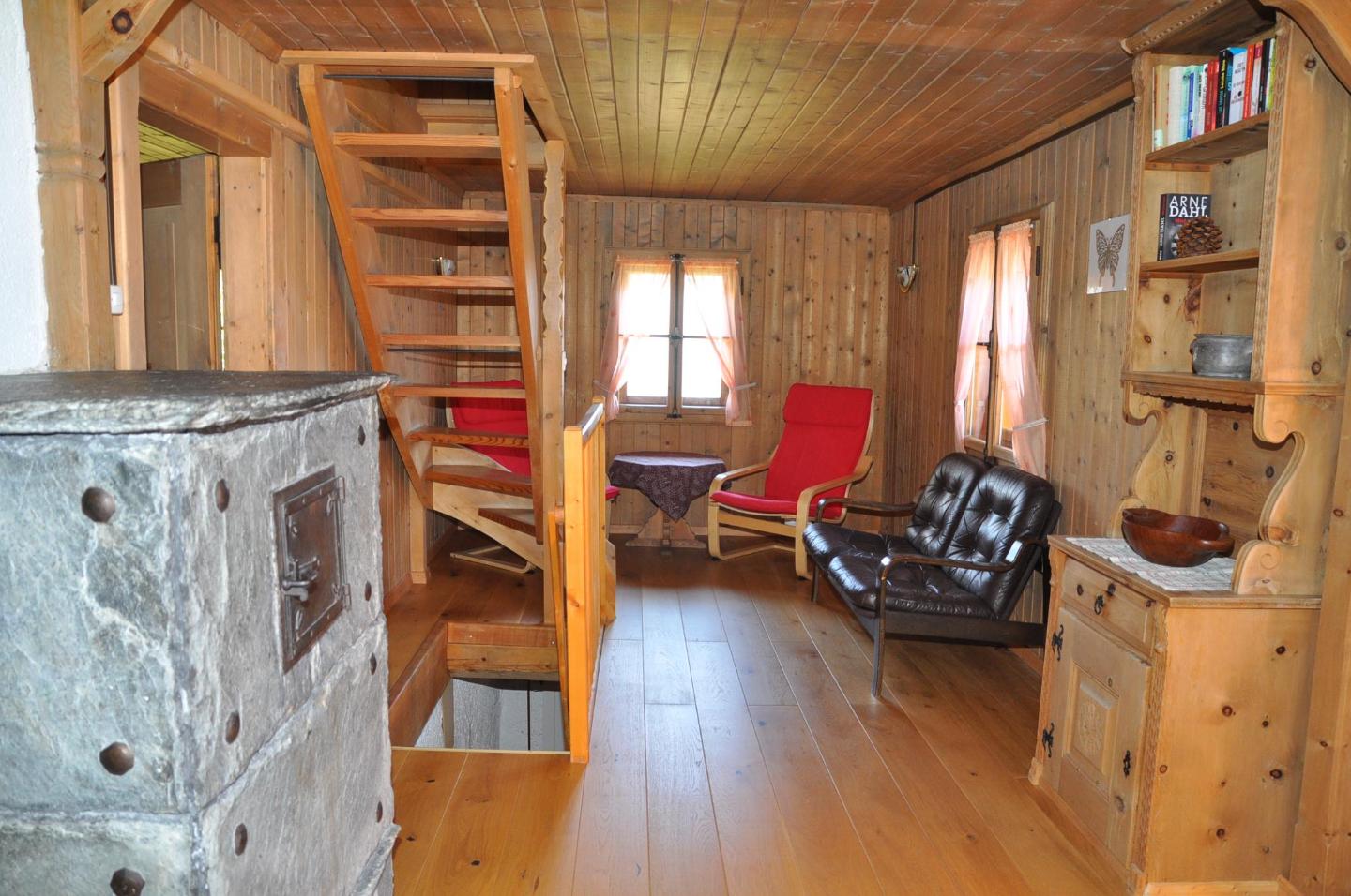 Im Erdgeschoss: Heimelige Wohnstube mit Ausgang zum Südbalkon. Küche mit Gasherd und Gas-Backofen. 1 Doppelschlafzimmer.