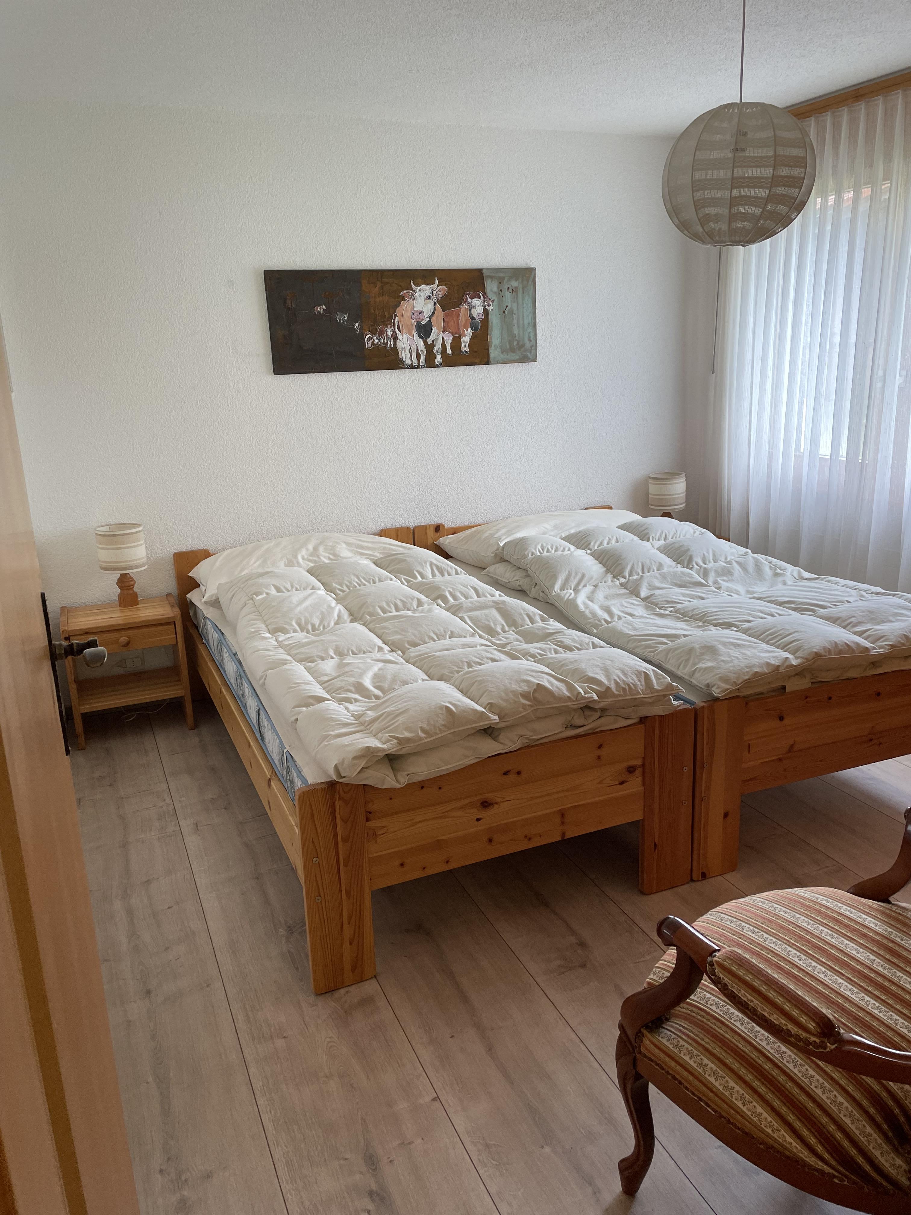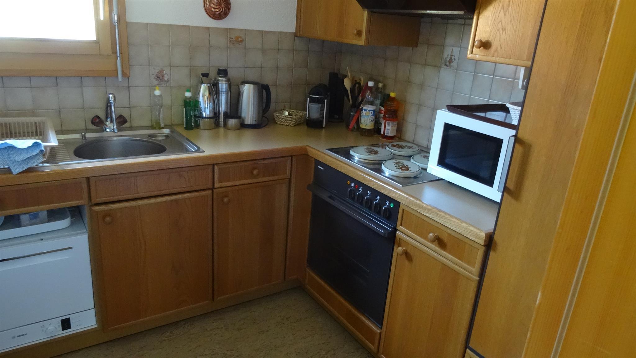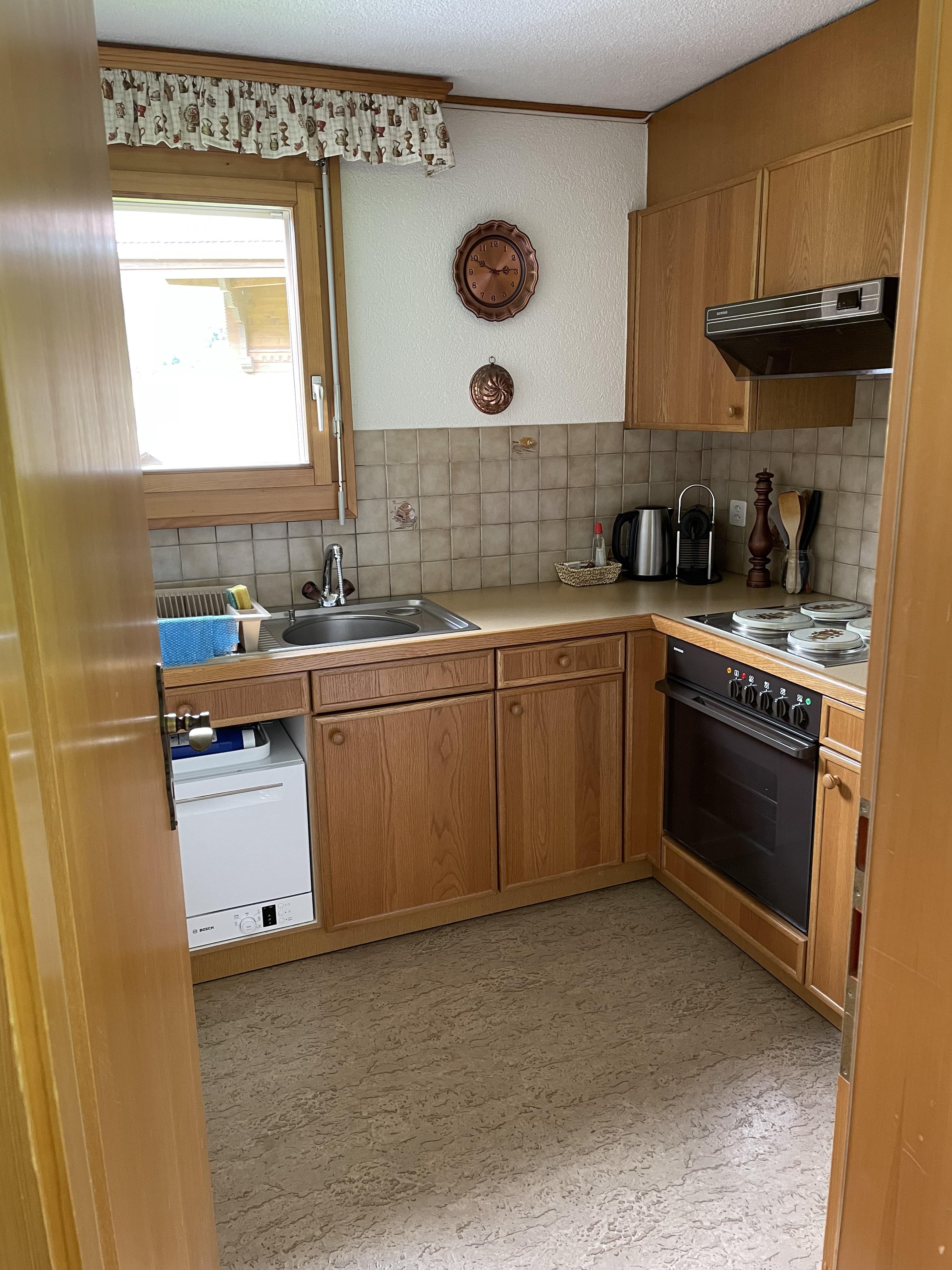 Gemütliche Ferienwohnung, im 2. Stock, separate Küche mit Geschirrspüler, Nespresso-Kaffeemaschine (Kapseln müssen selber mitgebracht werden), Essbereich, Wohnzimmer mich Cheminée, Schlafzimmer mit 2 Einzelbetten, das Auszieh-Sofa im Wohnzimmer, 160 x 200 cm, bietet zwei weitere Schlafmöglichkeiten, Badezimmer mit Badewanne. Die Wohnung wird ausdrücklich an Nichtraucher vermietet. Auch auf dem Balkon ist das Rauchen nicht erwünscht.