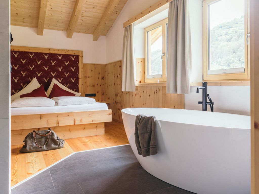 Ein Urlaubstraum auf 2 Etagen für 4 bis 5 Personen. Unten ein heimelig, gemütlicher Wohnraum mit Tiroler Kachelofen, Sitzecke und Küchenecke sowie 1 Schlafzimmer mit angrenzendem Badezimmer (Dusche/WC), Internet-Anschluss, Sat-TV, Radio. Über eine Holztreppe gelangt man in die Wohngalerie sowie zum 2. Schlafzimmer mit angrenzendem Badezimmer (Dusche/WC). Das Apartment ist komplett ausgestattet: Bettwäsche, Handtücher, Koch- und Speisegeschirr.