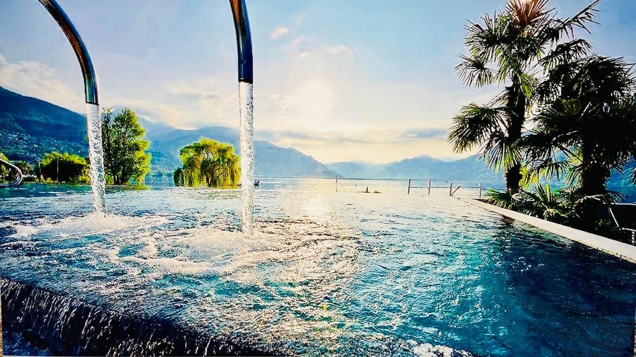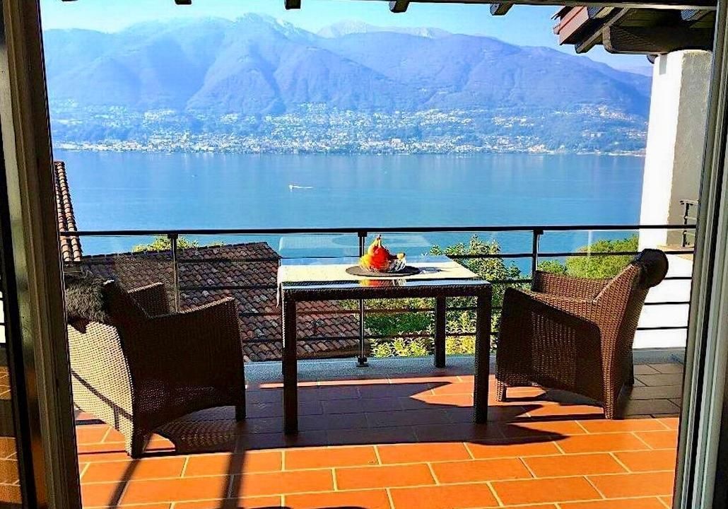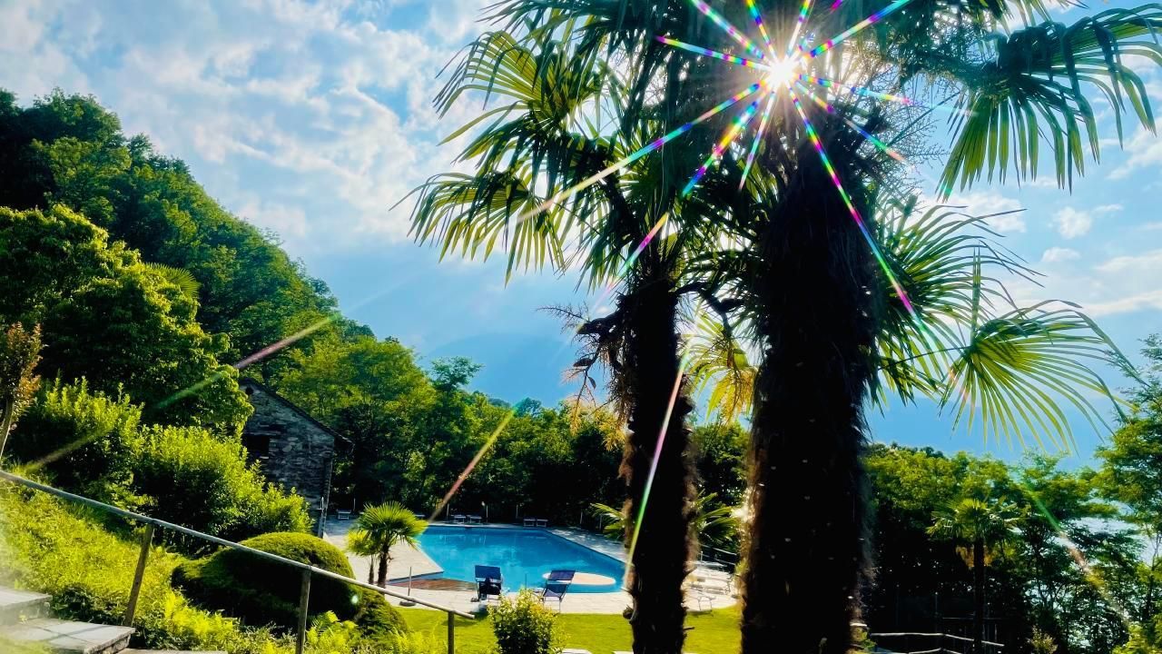 Der Außenbereich der Wohnung bietet mit seiner gedeckten Terrasse ein ideales Plätzchen zum Entspannen. Genießen Sie hier den atemberaubenden Seeblick und die beeindruckende Aussicht auf die Bergspitzen des Tessins. Eine Lounge-Möbel-Ausstattung sorgt dafür, dass Sie die Abendsonne in voller Pracht erleben können. Zusätzlich gewährt der parkähnlich gestaltete und gepflegte Garten mit Pool, Liegestühlen und weiteren Freizeitmöglichkeiten Ihnen einen komfortablen Aufenthaltsort im Freien.