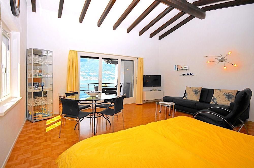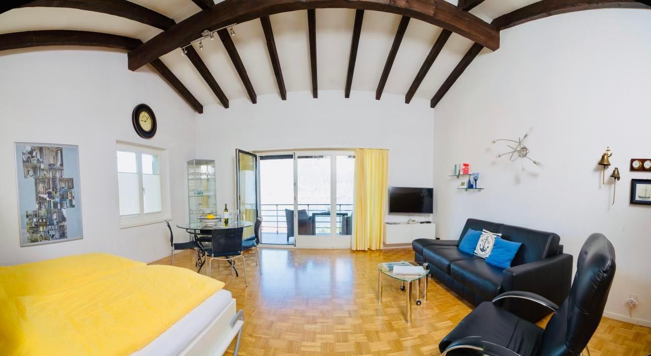 Willkommen in der Residenza Viramonte – Wohnung 46, einem idyllischen Rückzugsort, der mit seinem hellen und sonnigen 1-Zimmer-Ambiente für eine unvergessliche Auszeit sorgt. Die 45 qm große Wohnung im typischen Tessiner Baustil verzaubert mit ihrem großzügigen Wohngefühl. Hochwertiges Echtholz-Parkett unterstreicht das warme, einladende Ambiente, während hohe Räume mit Dachschrägen und sichtbaren Balken das Interieur optisch aufwerten.