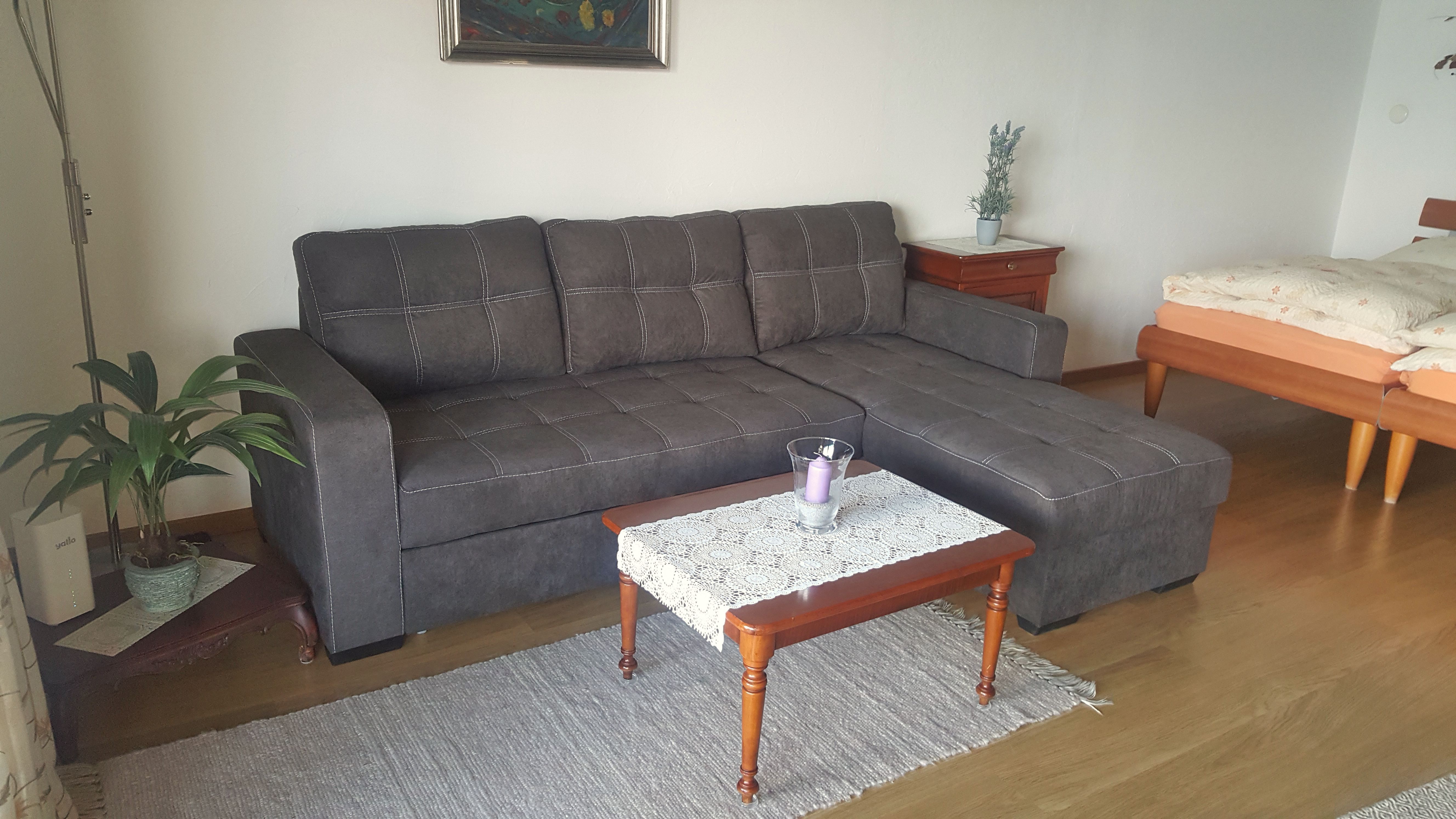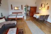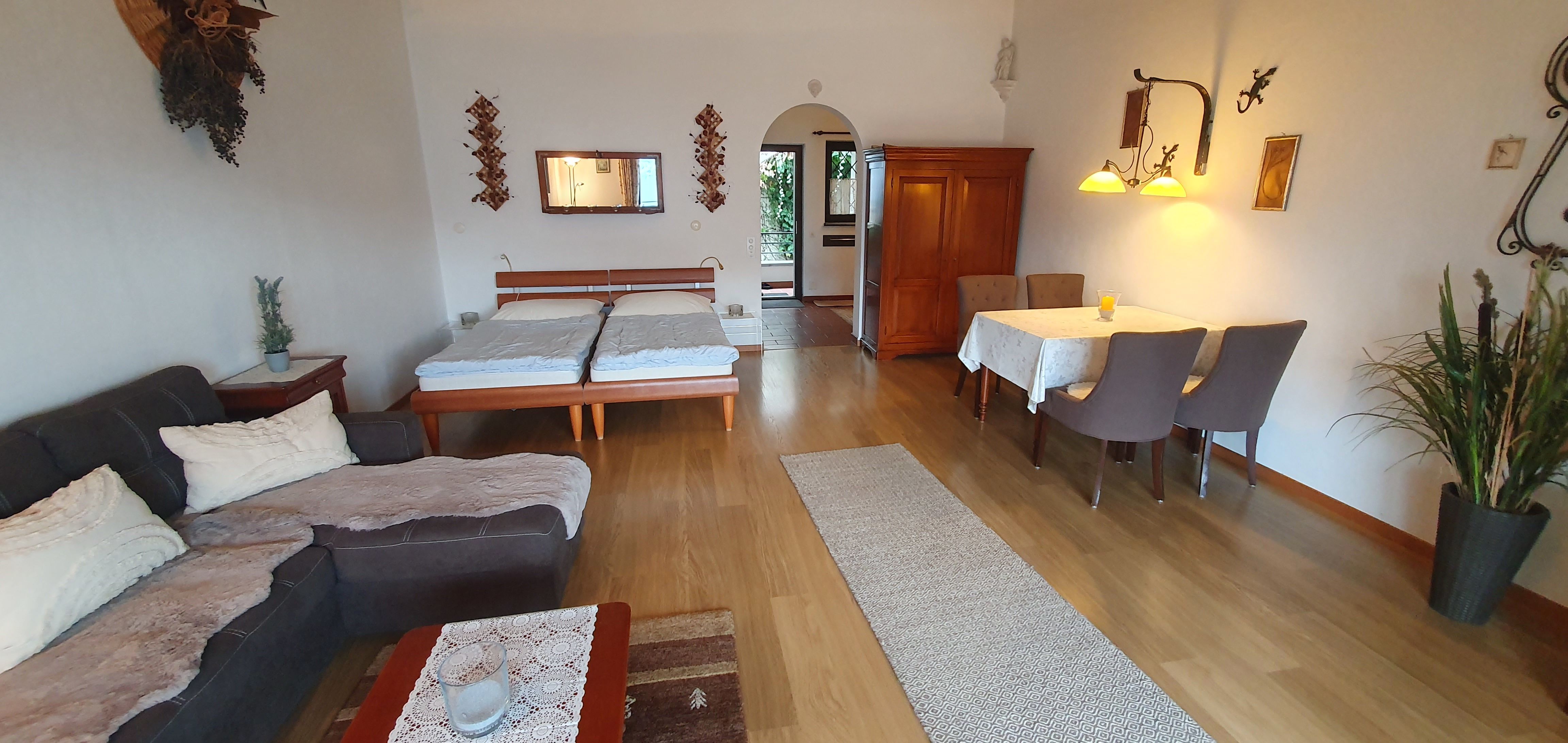 1-Zimmerwohnung mit kombiniertem Wohn- und Schlafbereich mit 2 Betten, ausziehbarem Schlaf-Sofa, TV mit Radio. Balkon mit Seeblick.