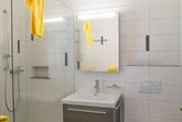 Ein Badezimmer mit Dusche/WC. Föhn vorhanden.