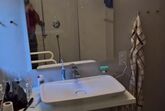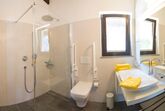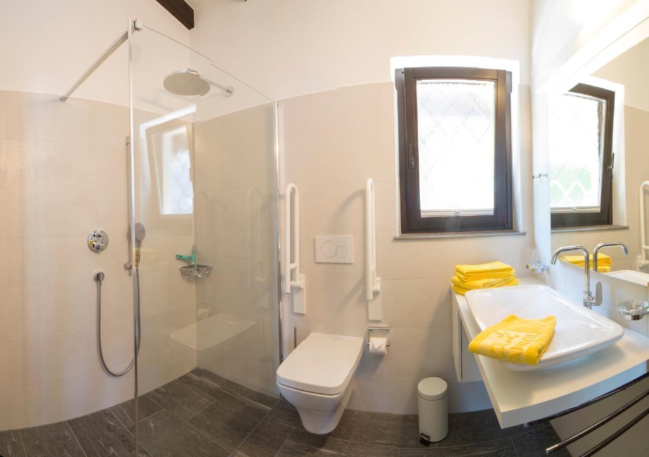 Modernes kleines Bad mit begehbarer Raindance-Dusche und Haltegriffen an der Toilette, Föhn vorhanden.
