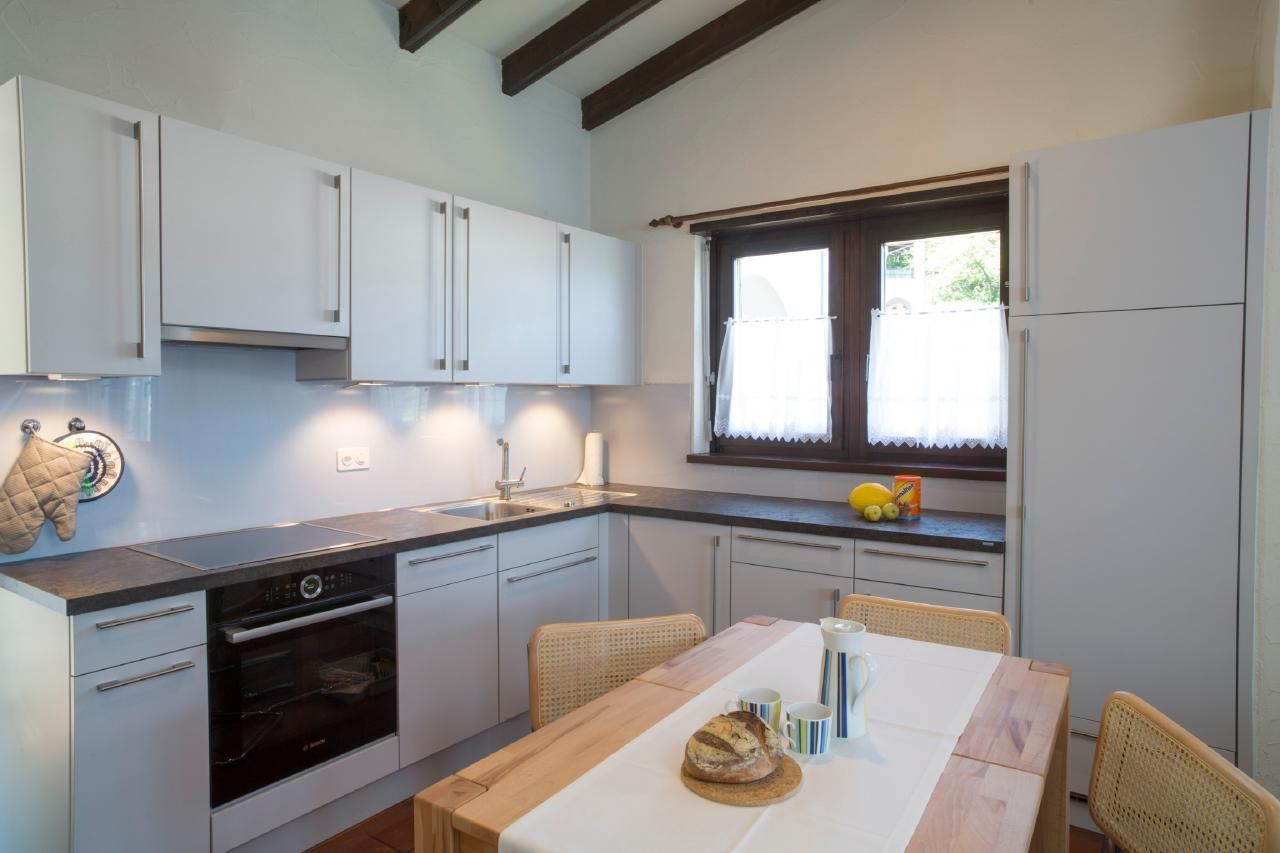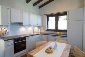 Küche, voll eingerichtet mit Induktionsherd, Backofen, Geschirrspüler und grossem Kühlschrank mit Gefrierfach.