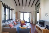 Die hohen Räume mit Dachschräge und Sichtbalken lassen die Wohnung grosszügig und luftig erscheinen.