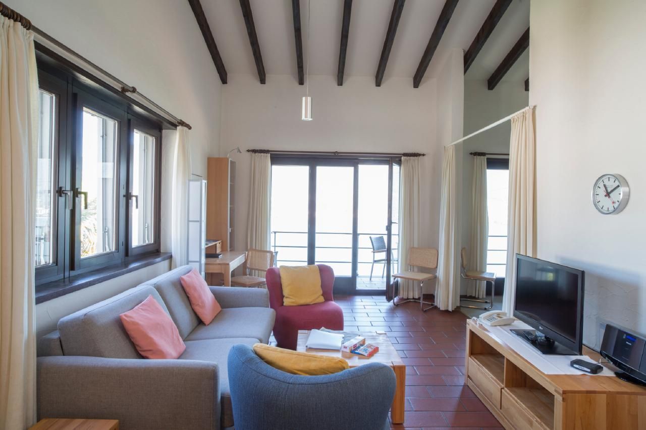 Wohnzimmer mit Schlafsofa für 1-2 Personen (160 cm breit), Sat-TV und WiFi, sowie direktem Ausgang auf den Balkon.