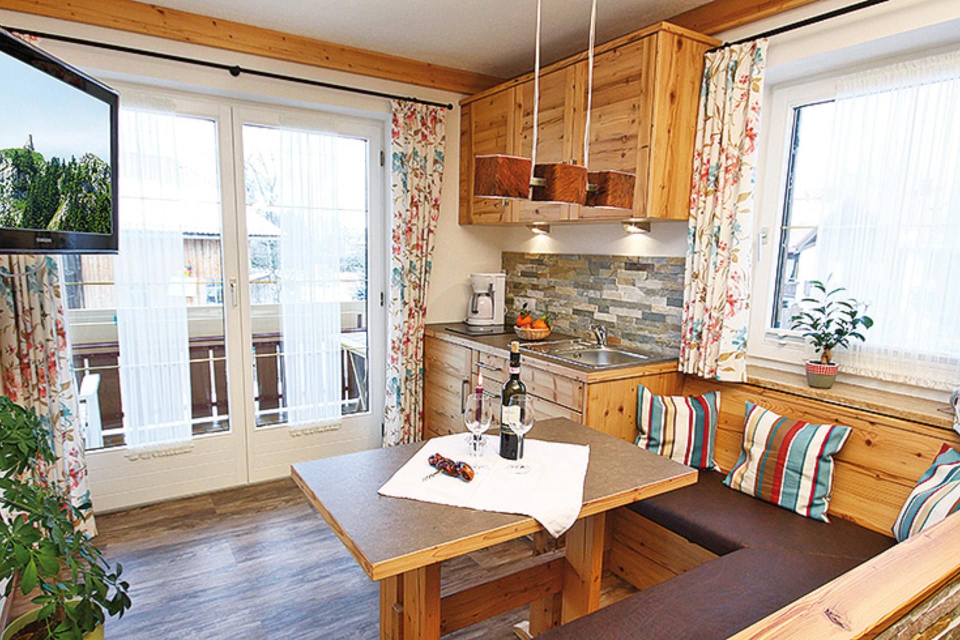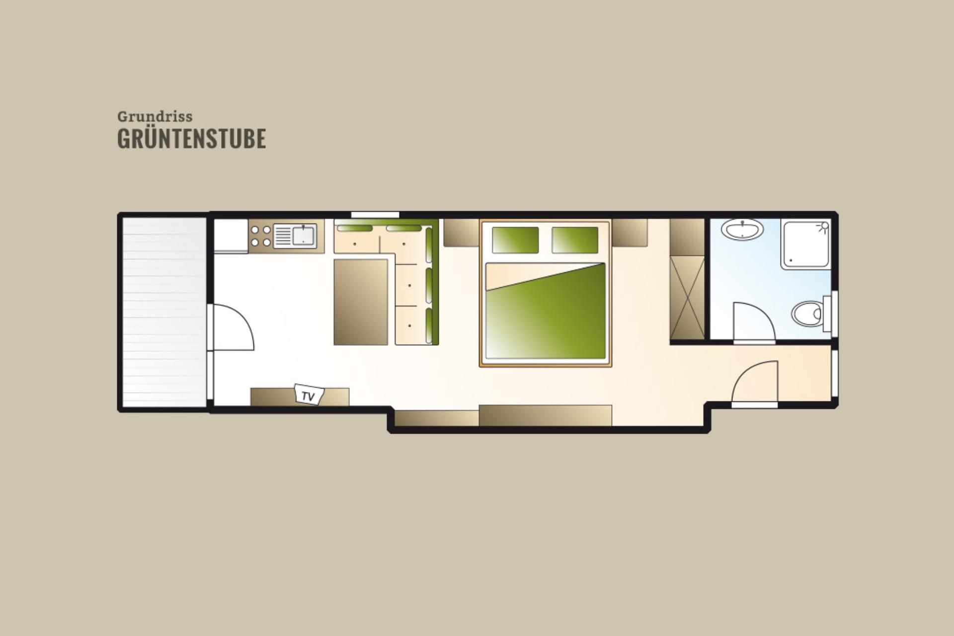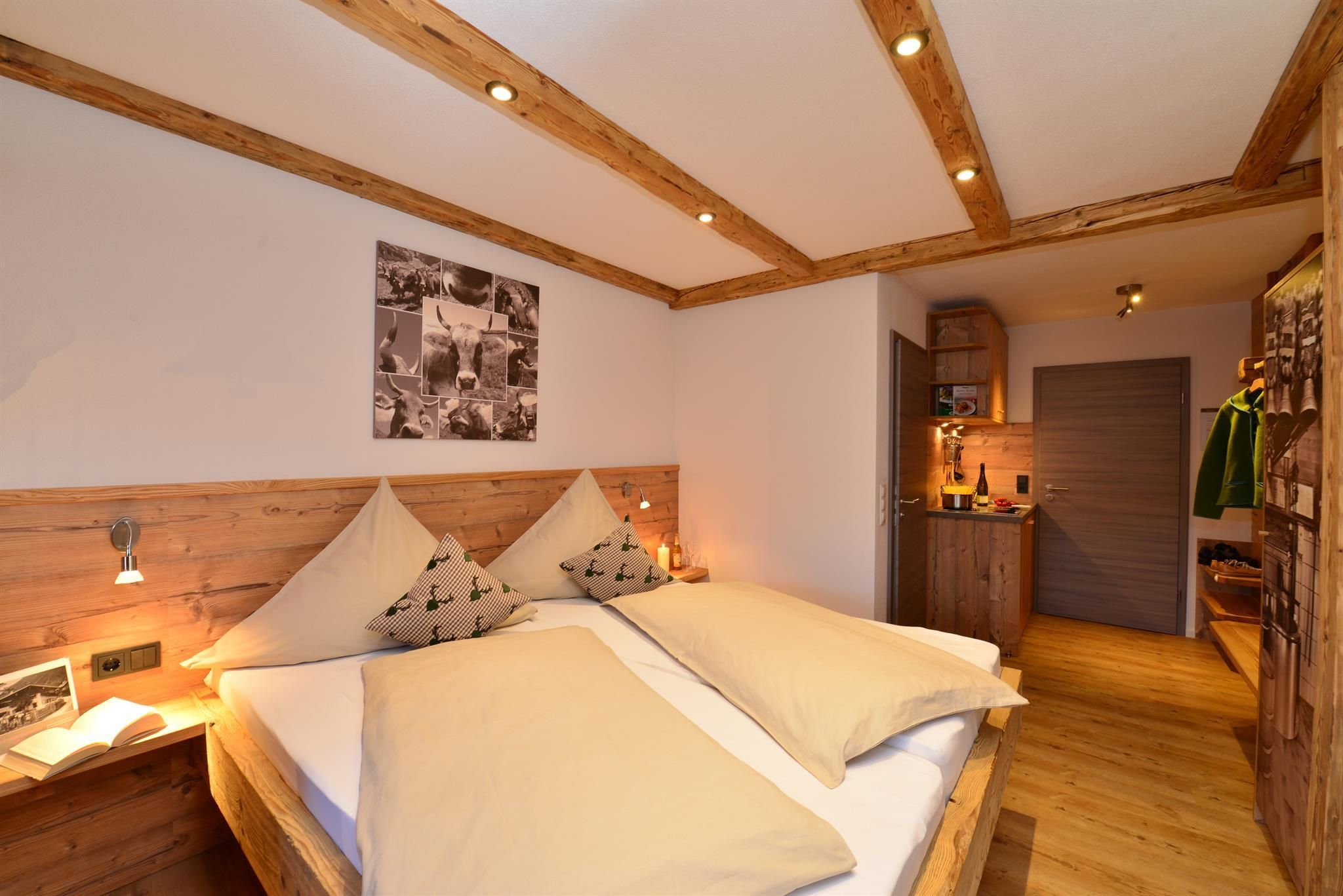 Hell und freundlich ist unser Themenzimmer Grüntenstube. Unser Hausschreiner hat sich für Sie etwas Besonderes einfallen lassen. Mit viel Altholz und modernen Ausstattungselementen lädt das Themenzimmer zum Träumen ein. Auch das Bad erstrahlt in neuem Glanz. Dank der kleinen Küchenzeile können Sie sich eine deftige Brotzeit oder kleinere Gerichte auf dem Zimmer zubereiten.