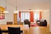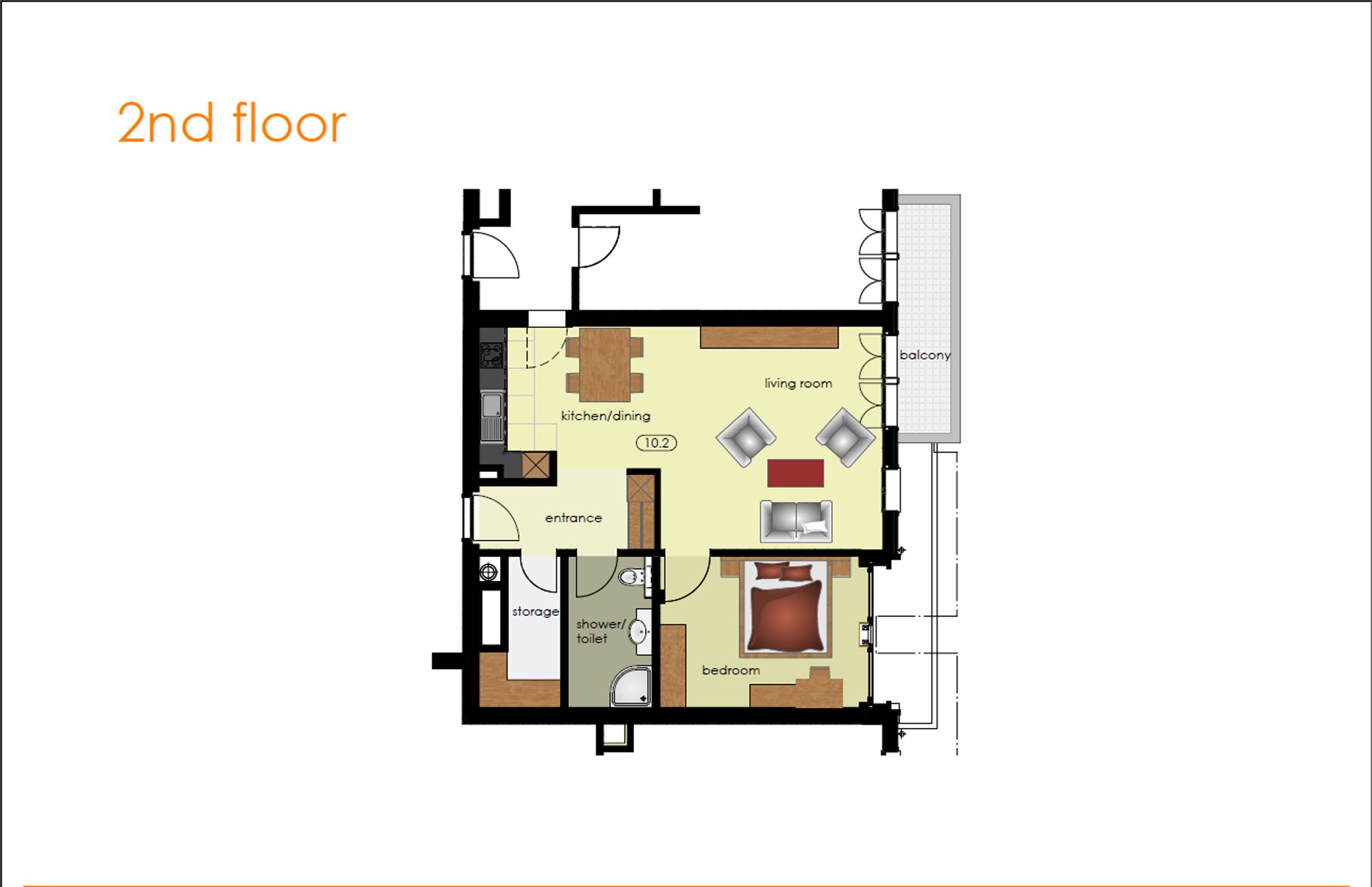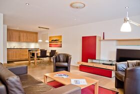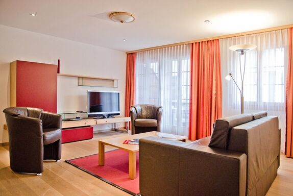 Die gemütliche 2.5 Zimmerwohnung im 1. Stockwerk ist 42m2 gross, verfügt über ein Schlafzimmer mit Doppelbett und ein Badezimmer mit Dusche und WC. Die gut ausgestattete Küche ist zum hellen Wohnbereich offen, hier befindet sich ein Sofabett für zwei weitere Gäste.