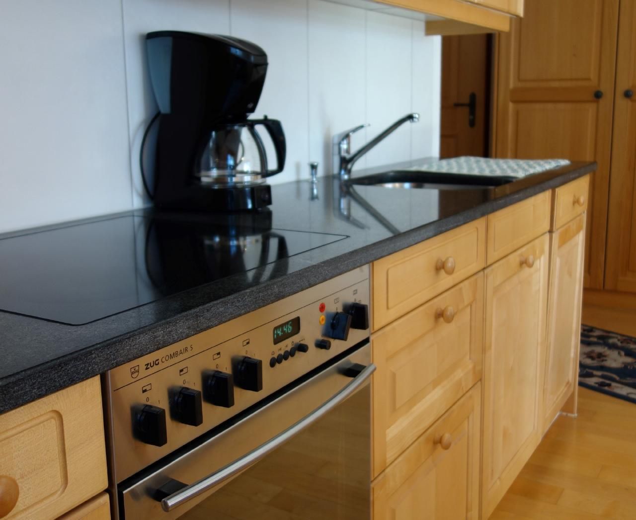 Küche: Komplett ausgestattet mit Keramikkochfeld, Backofen, Geschirrspüler, Filterkaffeemaschine sowie Fondue- und Raclette-Set.
