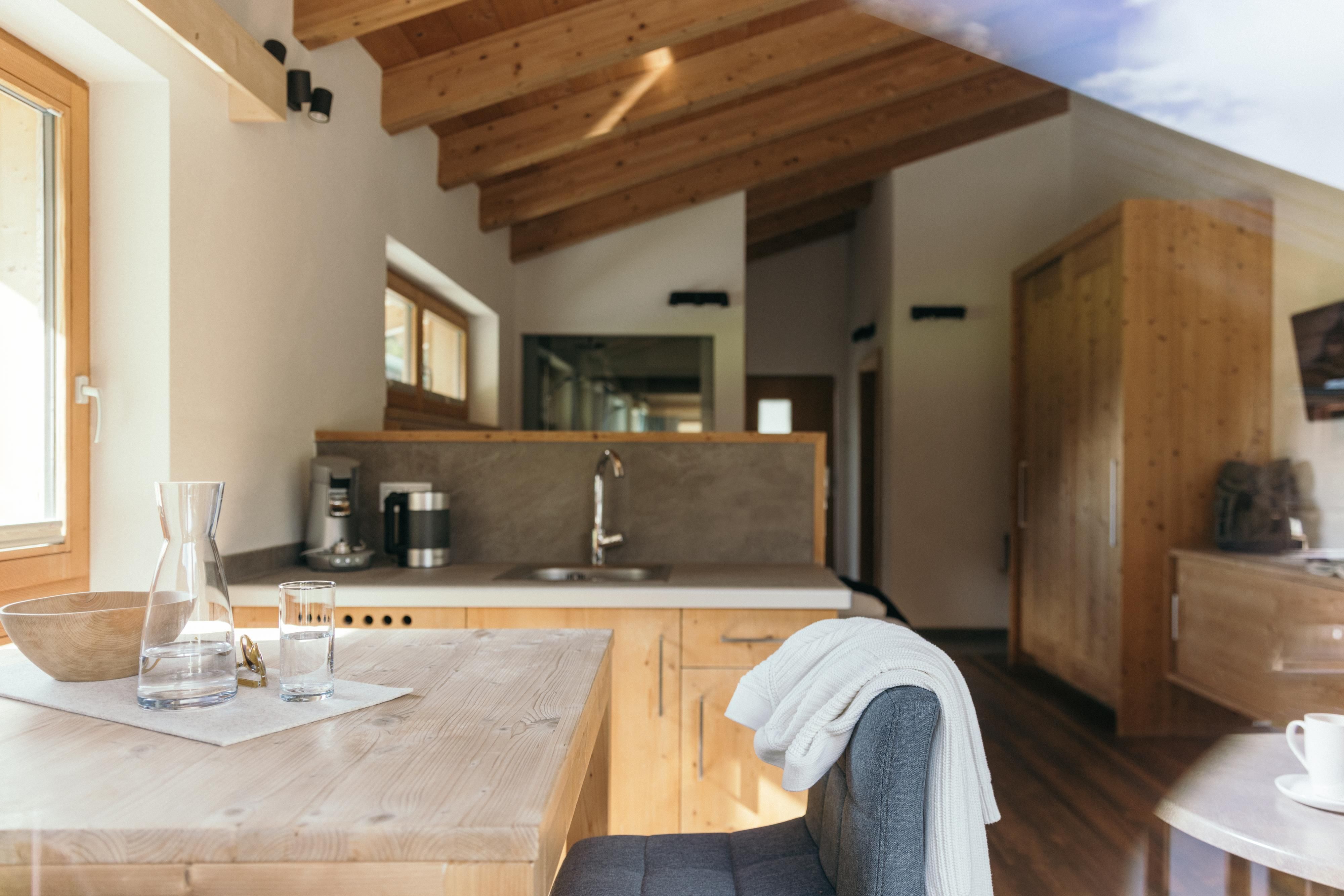Stil und Komfort par excellence: Sehr geräumige Doppelzimmer mit modernem, alpinem Flair. Das Badezimmer mit der Wellness-Dusche ist zum Zimmer hin verglast, das WC ist separat untergebracht. Der optisch abgetrennte Wohnbereich ist im stylishen Ledersofa, Sitzecke und einer kleinen Pantry-Küche ausgestattet. Inklusive Sat-Flat-TV, Radio, Kühlschrank, Kaffeemaschine, Zimmersafe und gratis W-Lan.