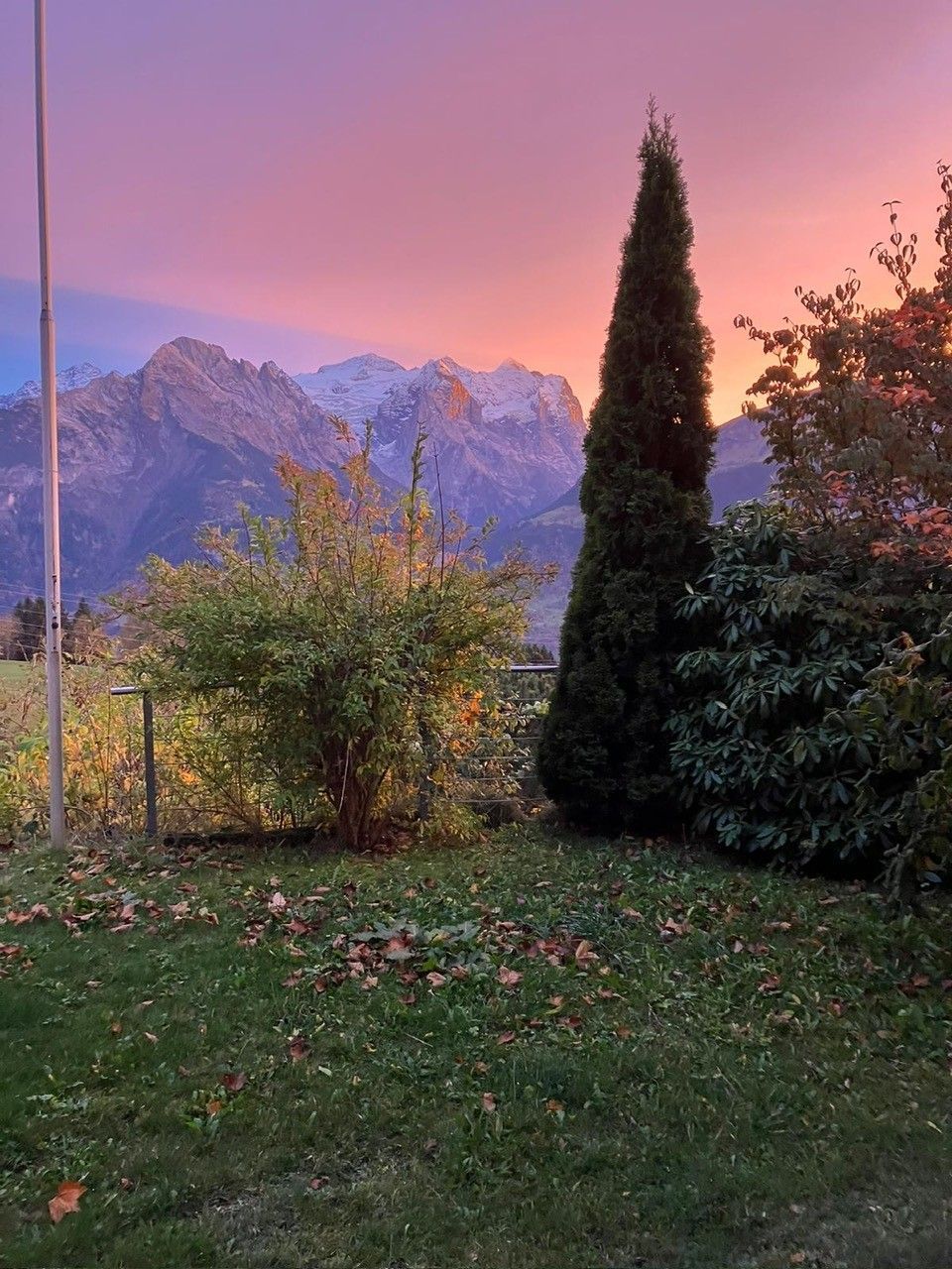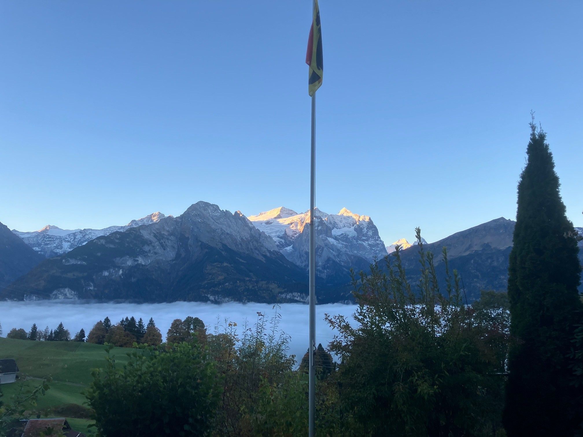 Der Außenbereich des Chalets lädt mit einer Rasenfläche, einem Spielplatz mit Kinderspielgeräten, Tischtennis und einem Aussengrill (Holzkohle und Feuerholz vorhanden) zum Verweilen ein. Ein Südbalkon mit elektrisch bedienbarer Sonnenstore bietet die perfekte Kulisse, um die atemberaubende Aussicht zu genießen.